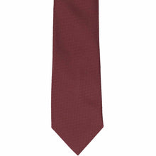 A dark red lattice patterned necktie, rolled to show the subtle texture
