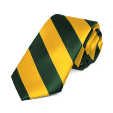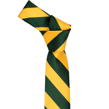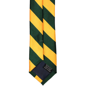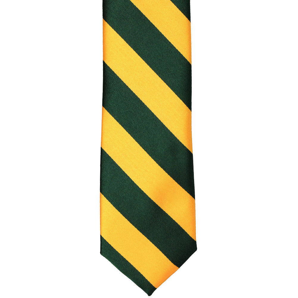 This hunter green and golden yellow striped tie is a top pick for everyday, school spirit or uniform wear. It's cut to a modern, 2.5-inch slim width for adults and teens. Crafted from heavyweight woven material with a smooth, satin finish.