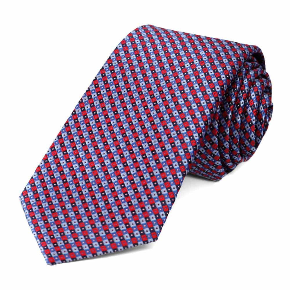 Add a modern touch to your look with this eye-catching set. It features a red and blue checkered men's tie with a matching pocket square. (It's just a little bit patriotic, isn't it?) The tie is a slim, 2.75-inches wide while the pocket square is a standard, 9.5-inch square size. This one will look great with a fitted navy blue suit or your favorite pair of khakis at a 4th of July event.