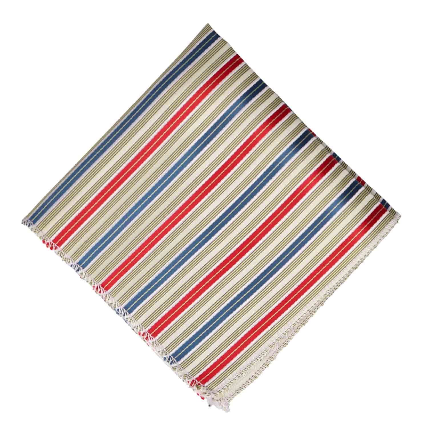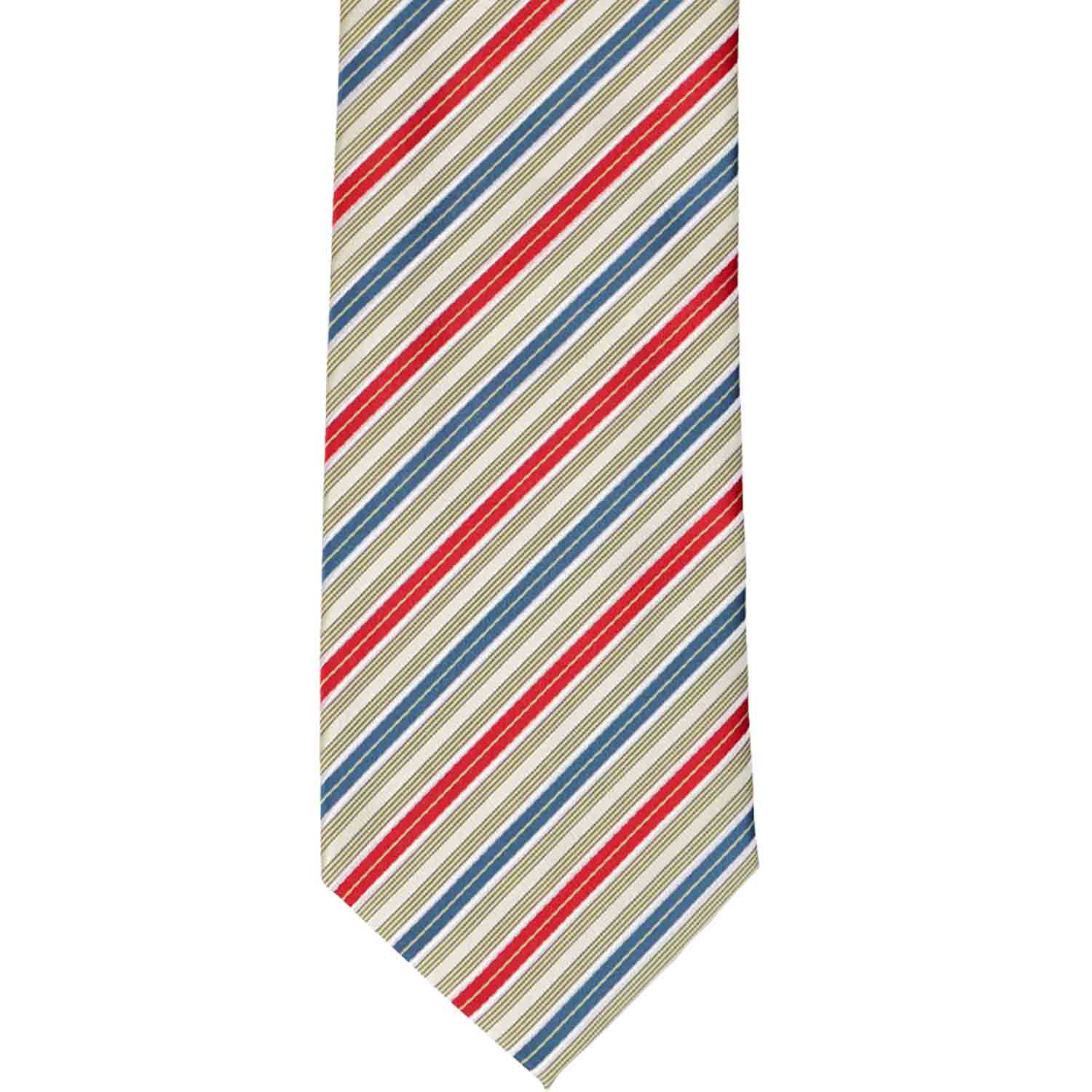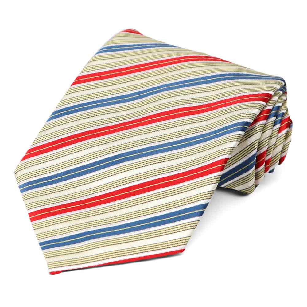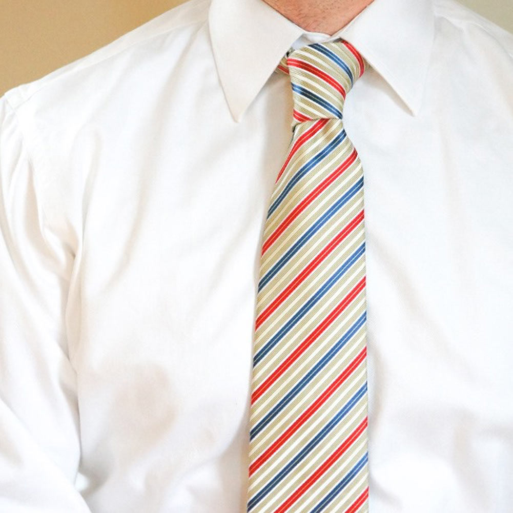 Show off your patriotic side with this pencil striped red, white and blue tie (with hints of yellow). Pair it with a navy blue suit, or a white dress shirt and navy slacks. A matching pocket square is included for your more formal occasions.