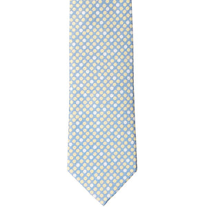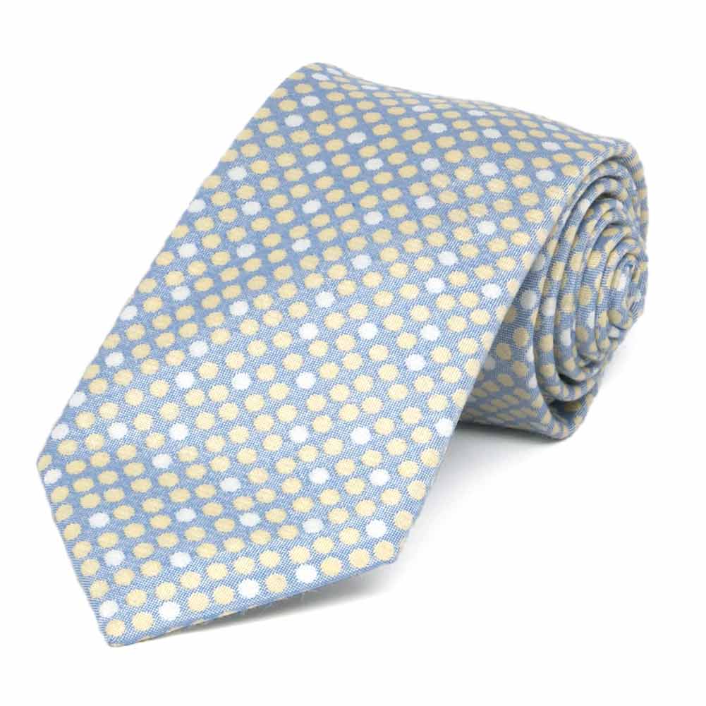 Playful white and yellow dots are set against the powder blue background of this made-for-spring tie. This is a wear-anywhere tie. Casually for a date, dressed up for work, Easter Sunday with your best navy blue suit. Or, coordinate your groomsmen’s attire and easily match your wedding colors for a bit of fun.