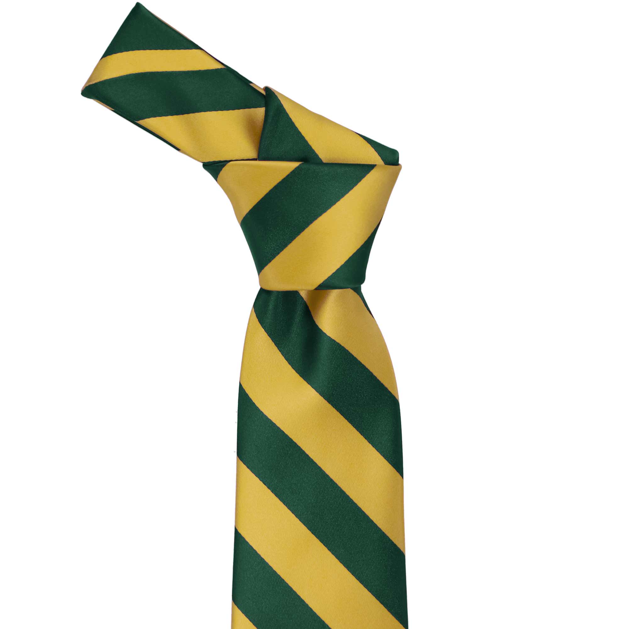 One of our most popular striped tie combos, now in an extra long length for big and/or tall men. This hunter green and gold striped tie features a 63-inch length, 6-inches longer than our standard-sized ties. Made from 100% polyester microfiber. Also available in a standard-sized tie.