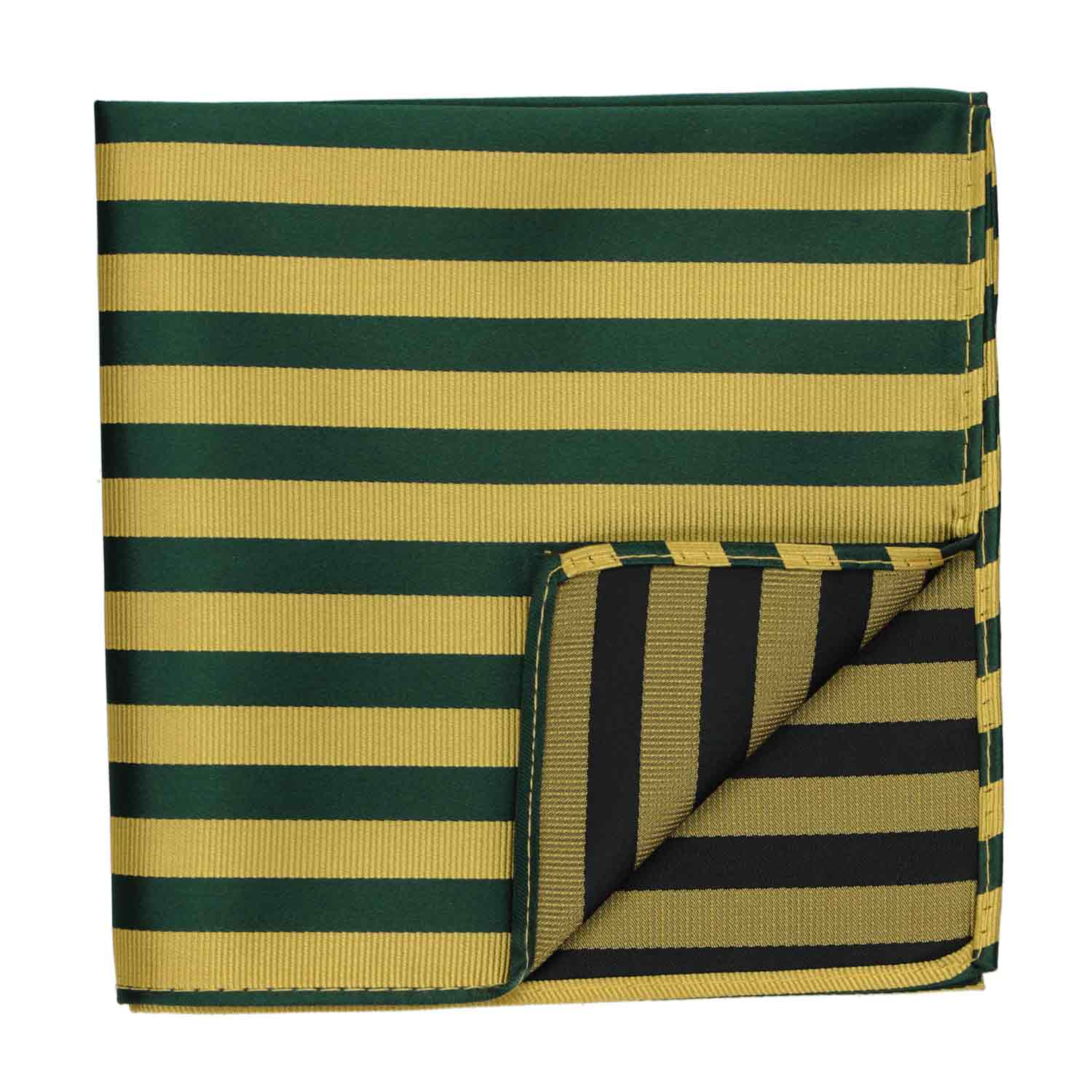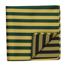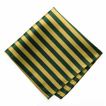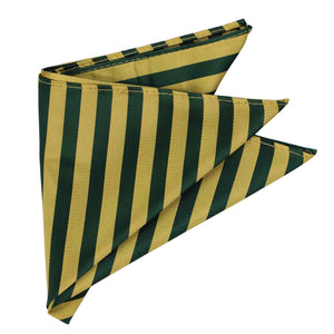 Alternating ribbed and satin stripes in hunter green and gold make this pocket square the perfect statement piece to represent your school or team's colors. Pair it with the matching necktie or bow tie (available for purchase), or coordinate with a solid color tie.