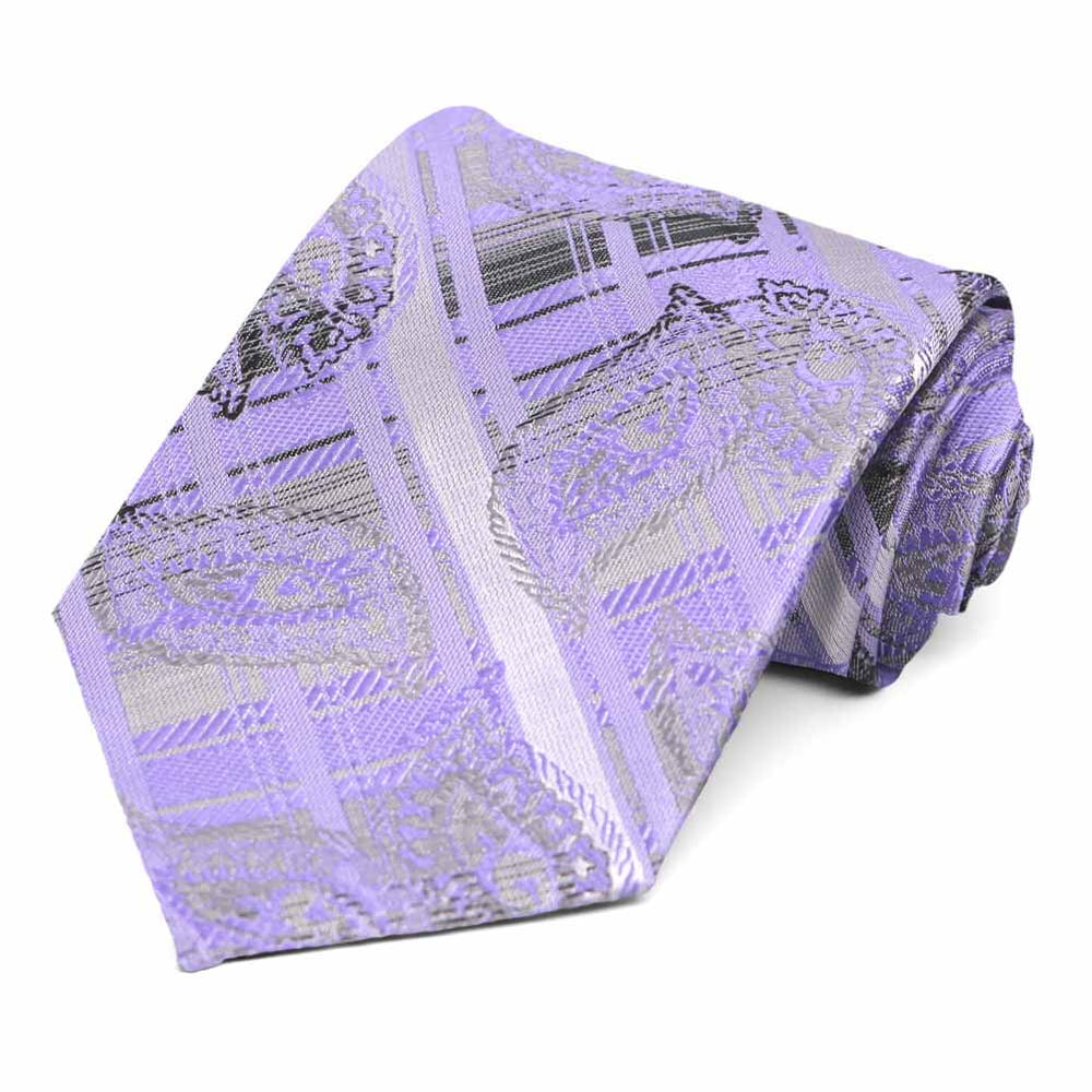 The classic appeal of plaid combined with a intricate paisley print. Purple paisley pops from the plaid background of this gray and purple tie. Wear this for a casual everyday office look, or dress it up with the included matching pocket round and a dark gray suit for Easter.