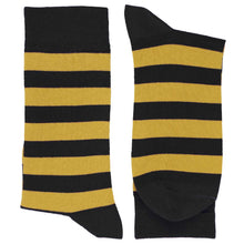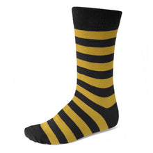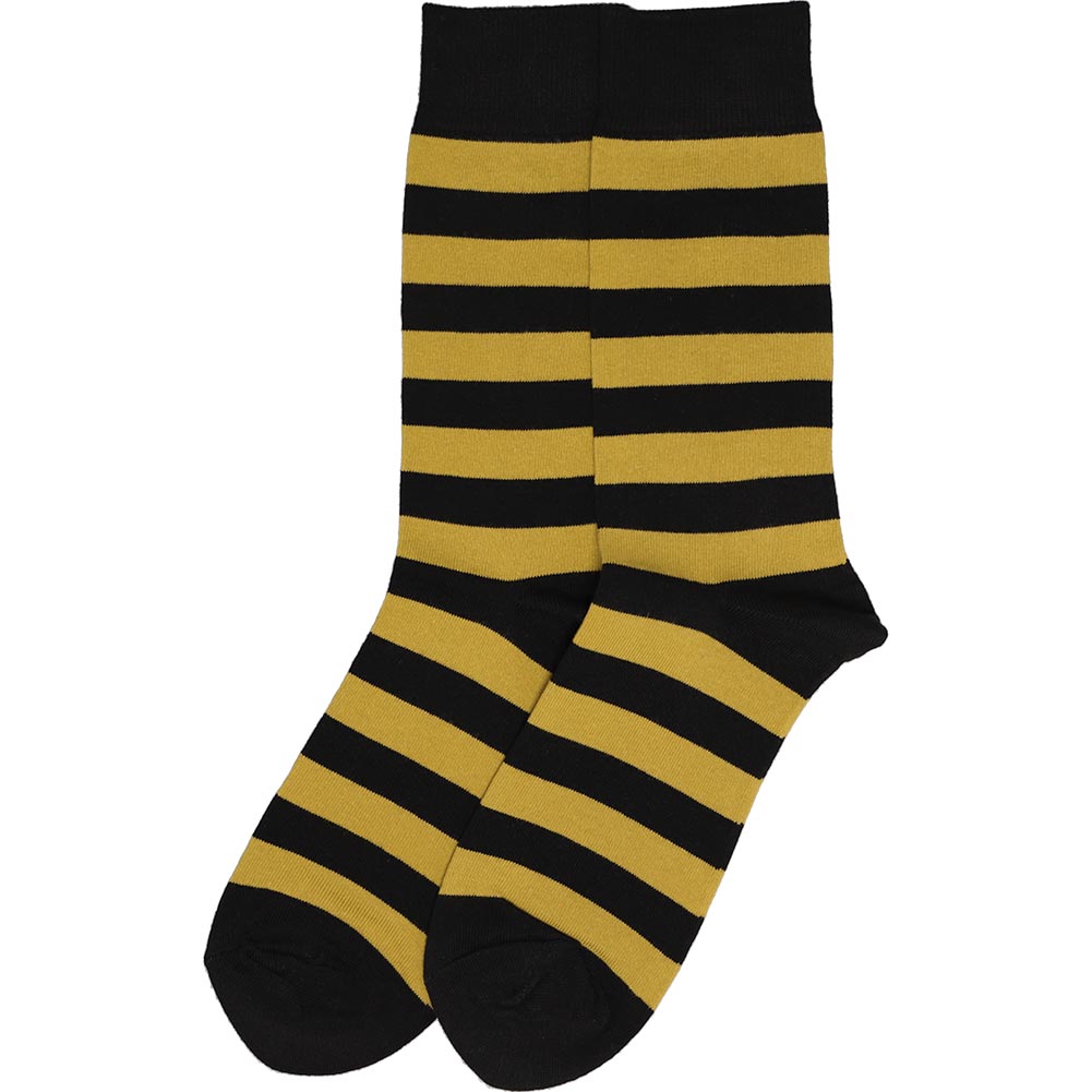 Coordinate your look from head to toe with a pair of men's black and gold striped socks. These horizontal striped dress socks can be worn with business or everyday attire. (They're a popular pick for matching school or sports team colors, too.)