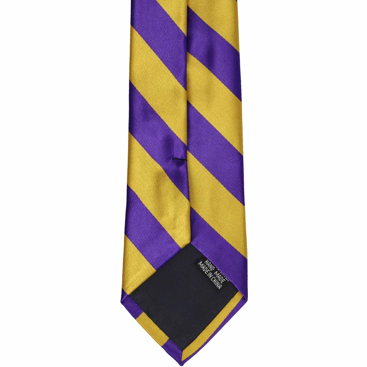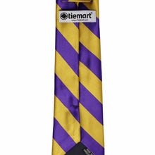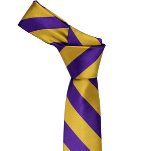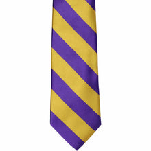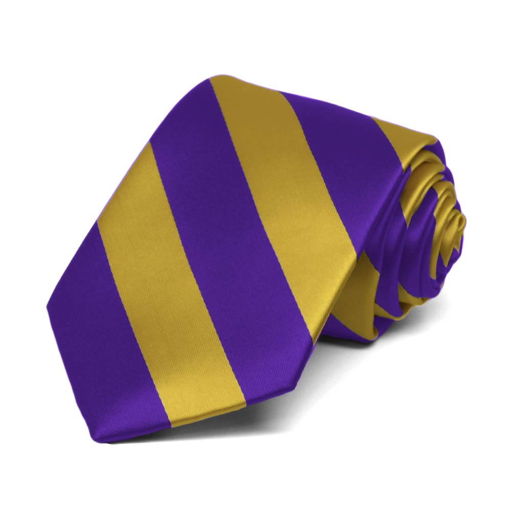 Consider this dark purple and gold striped boys' necktie for his school, sports team, or group uniform. The combination of deep purple and brassy gold creates a preppy but bold combo that looks sophisticated and spirited. Featuring stripes that measure 0.75-inches wide, this tie adds a handsome, coordinated look to any outfit. He'll look incredibly sharp and feel proud when he ties this necktie himself.