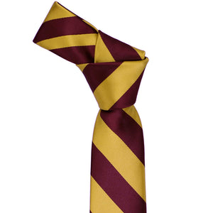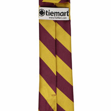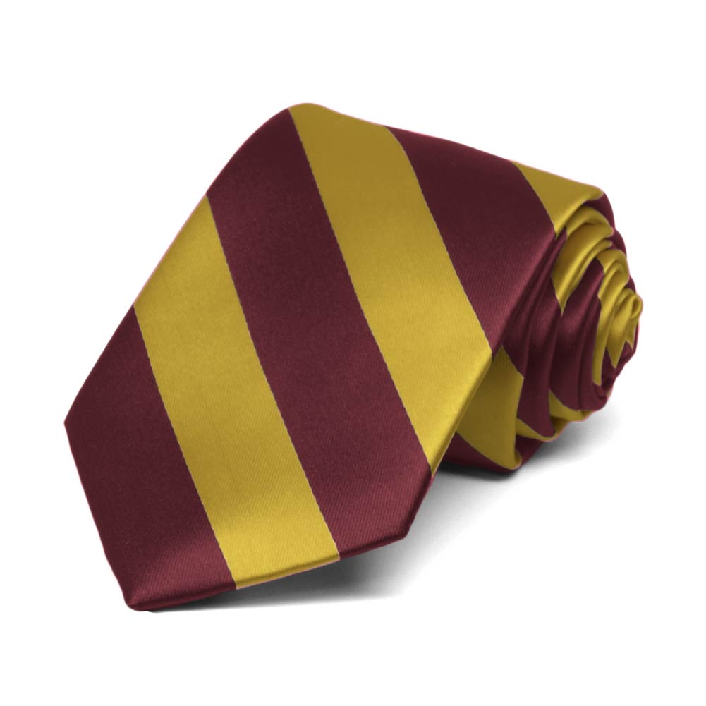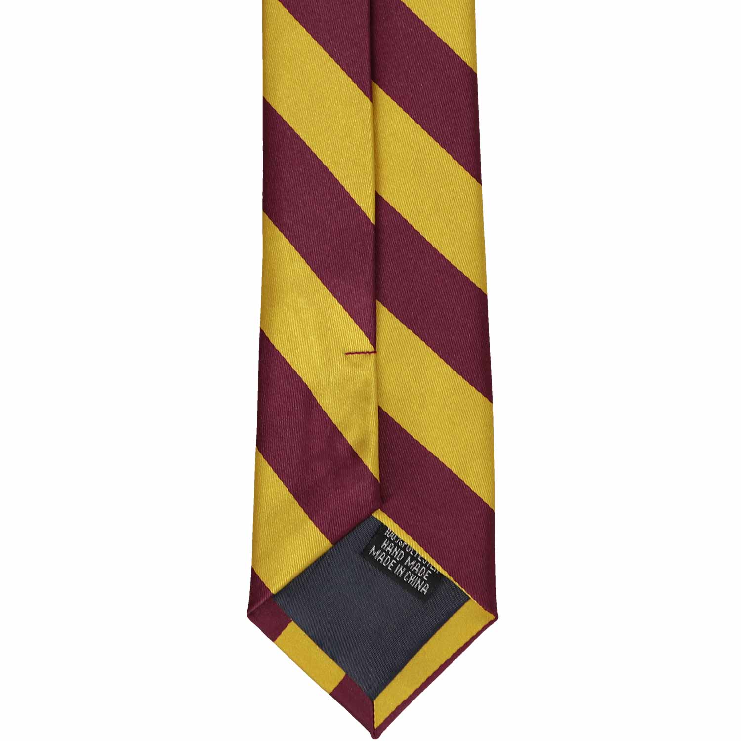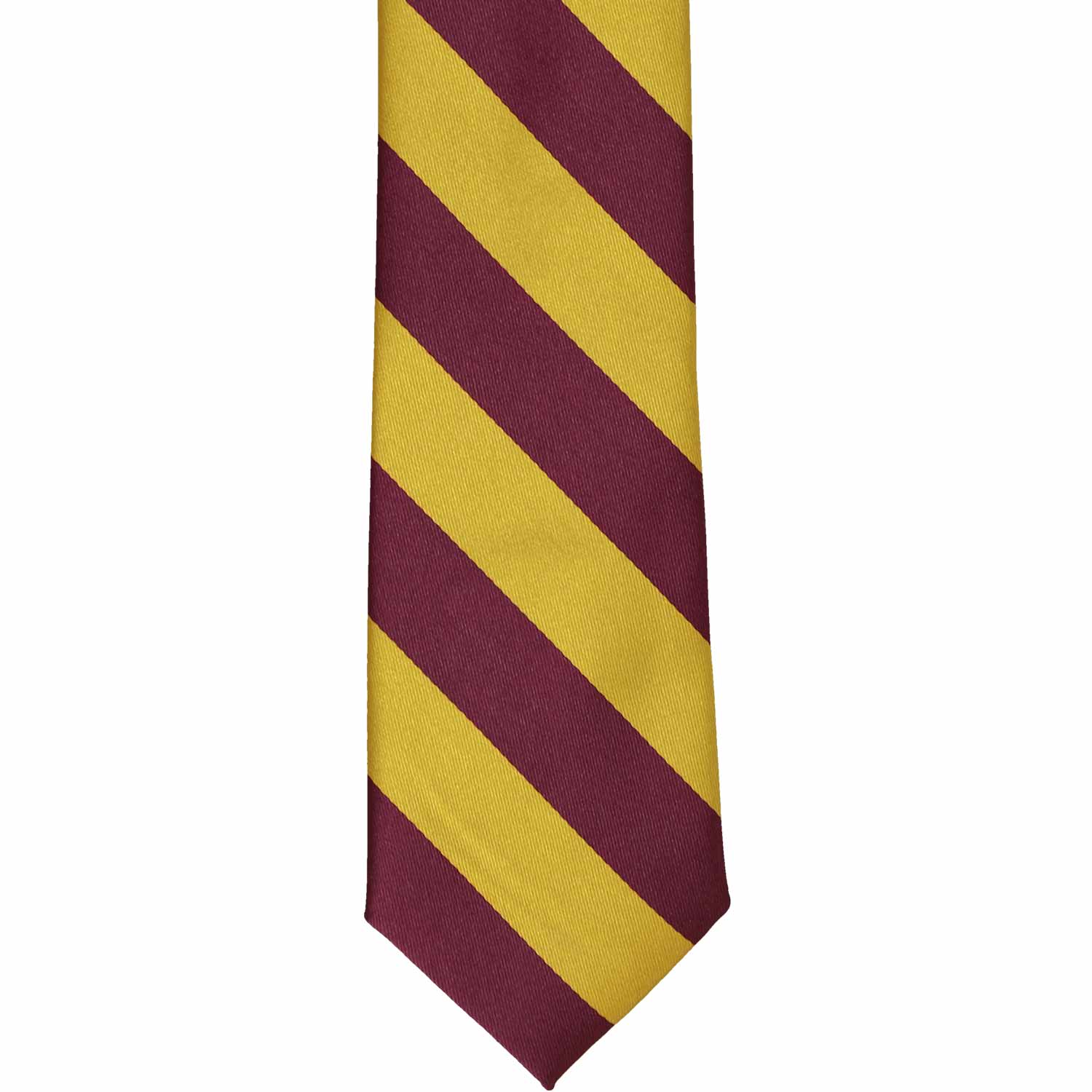 He'll make an impression with this striking maroon and gold striped boys' necktie. The two-color repp stripes have a classic, collegiate vibe that is perfect for school uniforms, sports teams, or representing favorite group colors. He'll feel the confidence of a grownup when he ties this necktie himself and looks sharp representing his colors.