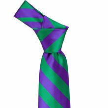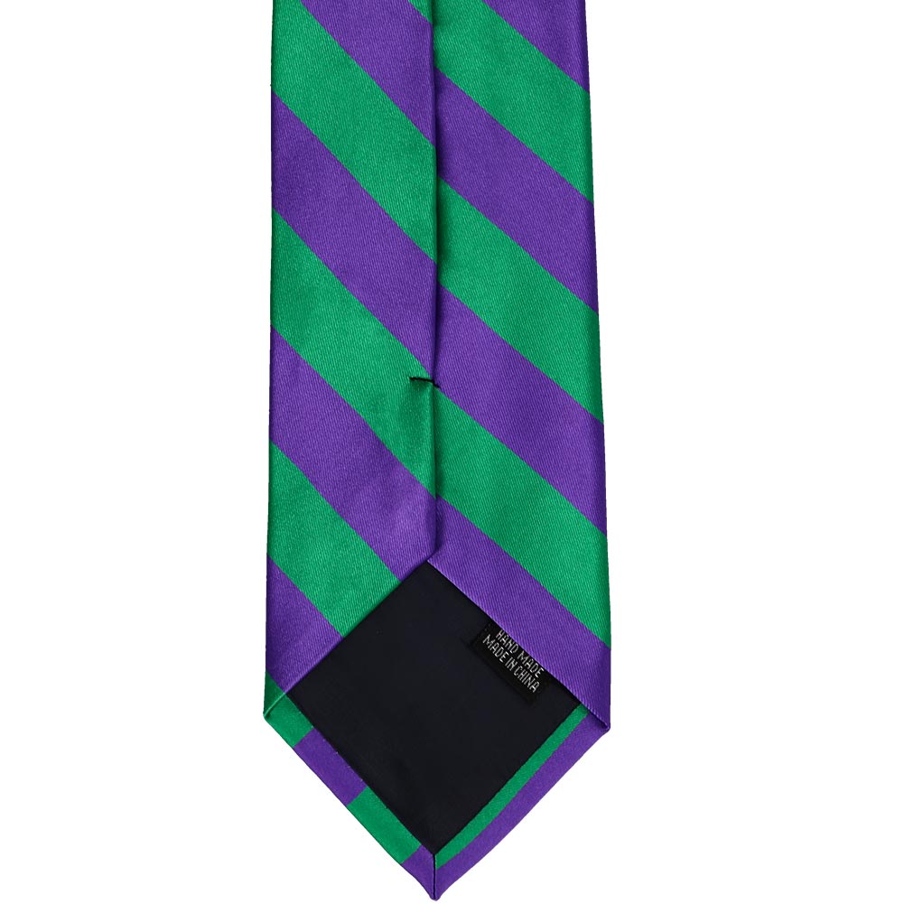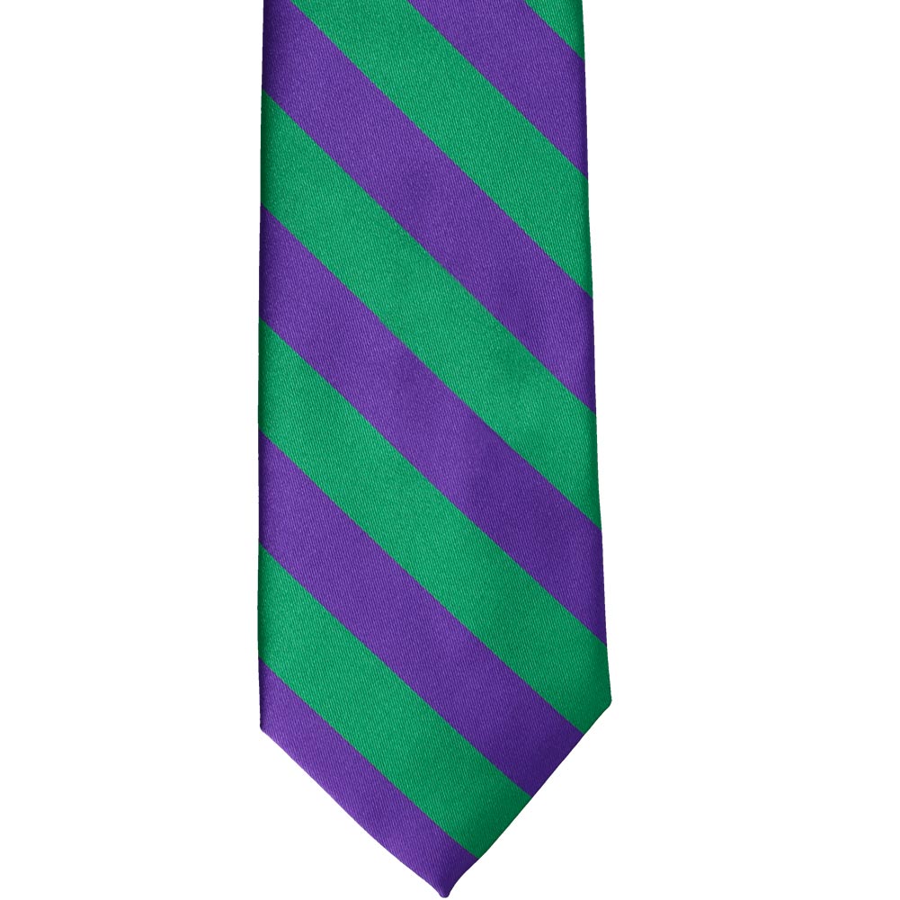 This kelly green and purple striped tie is great for wearing your favorite colors, repping your team, or showing your school spirit. It's a bold color combination in a classic collegiate stripe. The self-tie style can be added to a button down and slacks for a school uniform or worn with a suit for dressier occasions.