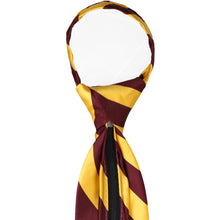 Support your school or cheer on your favorite team with a maroon and golden yellow striped tie. It's pre-tied and easy to use, but when worn it will look just like a standard necktie. The secret is a zipper in the tie tail that allows the collar to quickly expand and fit over the head without having to tie a knot. Available in a standard men's 20-inch length or 17-inch length for shorter men, women and teens.