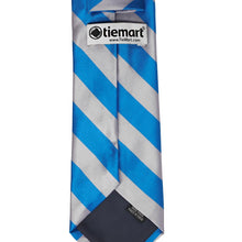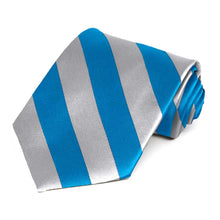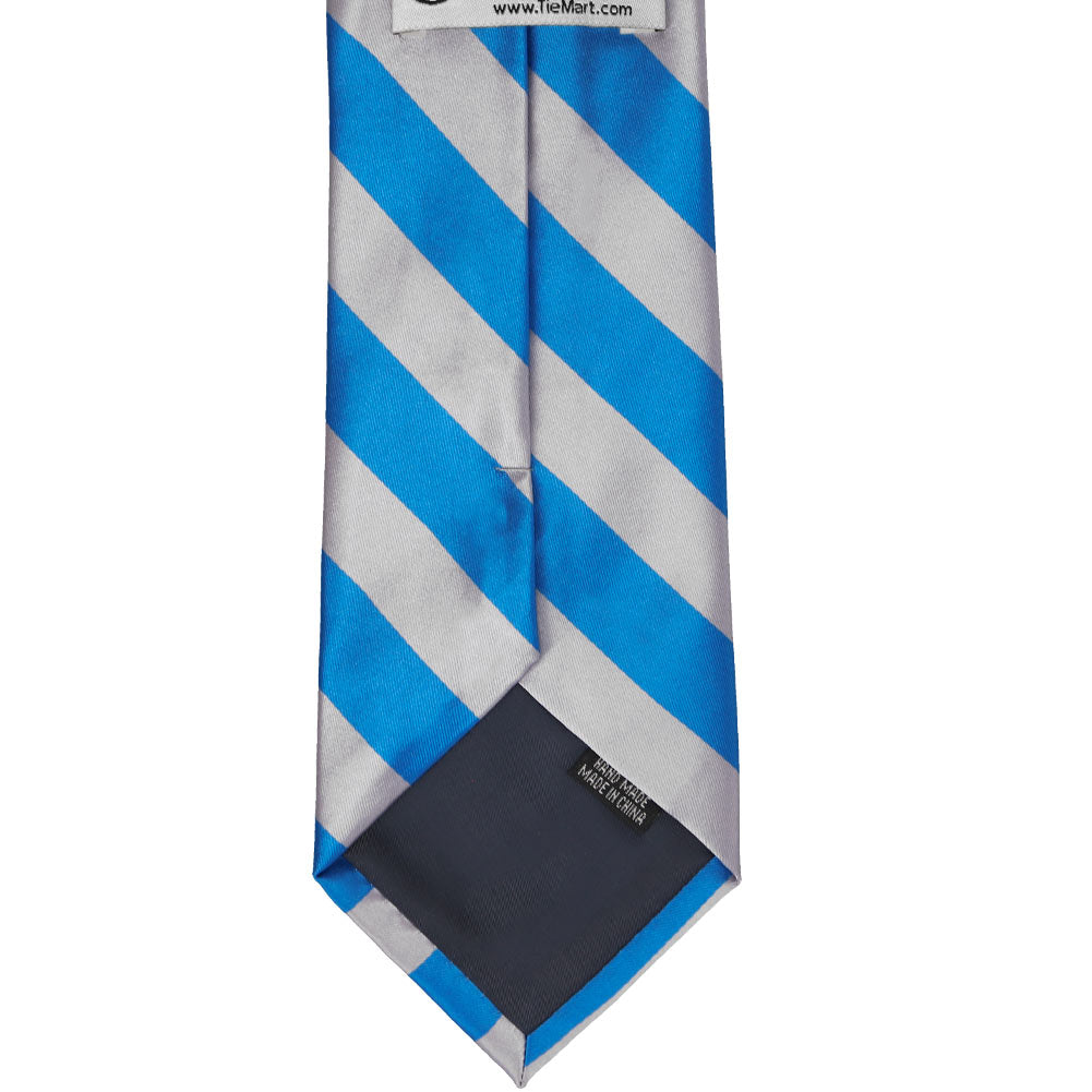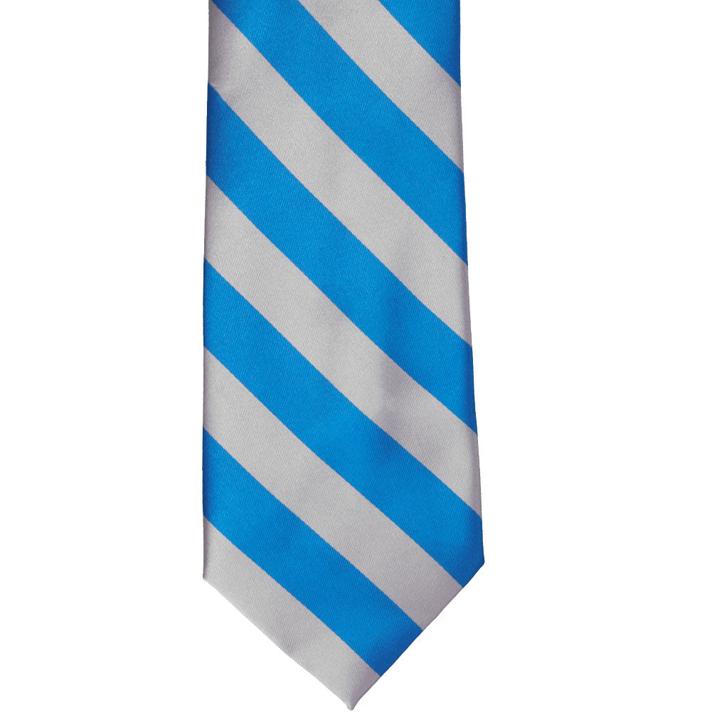 Add a splash of color to your look with this bold peacock blue and silver striped tie. The classic 0.75-inch wide stripes are the perfect width for getting noticed without being overwhelming. Add it to a black suit for a dashing formal look or use it to match school or company colors as part of a uniform.