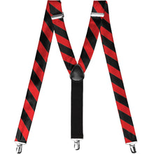 Whether you're showing your school spirit or rooting for your favorite team (in style), these red and black striped suspenders are a must. Made from the same material as our ties, the suspenders feature 1.25-inch wide straps with 0.75-inch wide stripes. They adjust from approximately 30.5 to 49-inches to fit most men, women and teens and hold securely in place with three silver-tone clips. Y-back design with a black crosspatch. Looks great with the matching bow tie and socks!