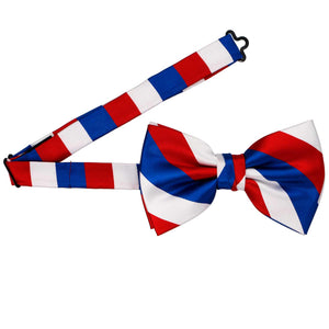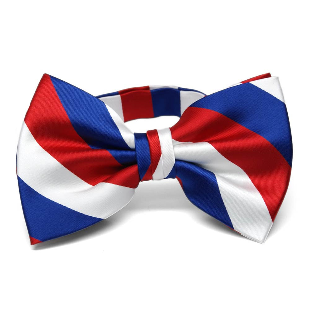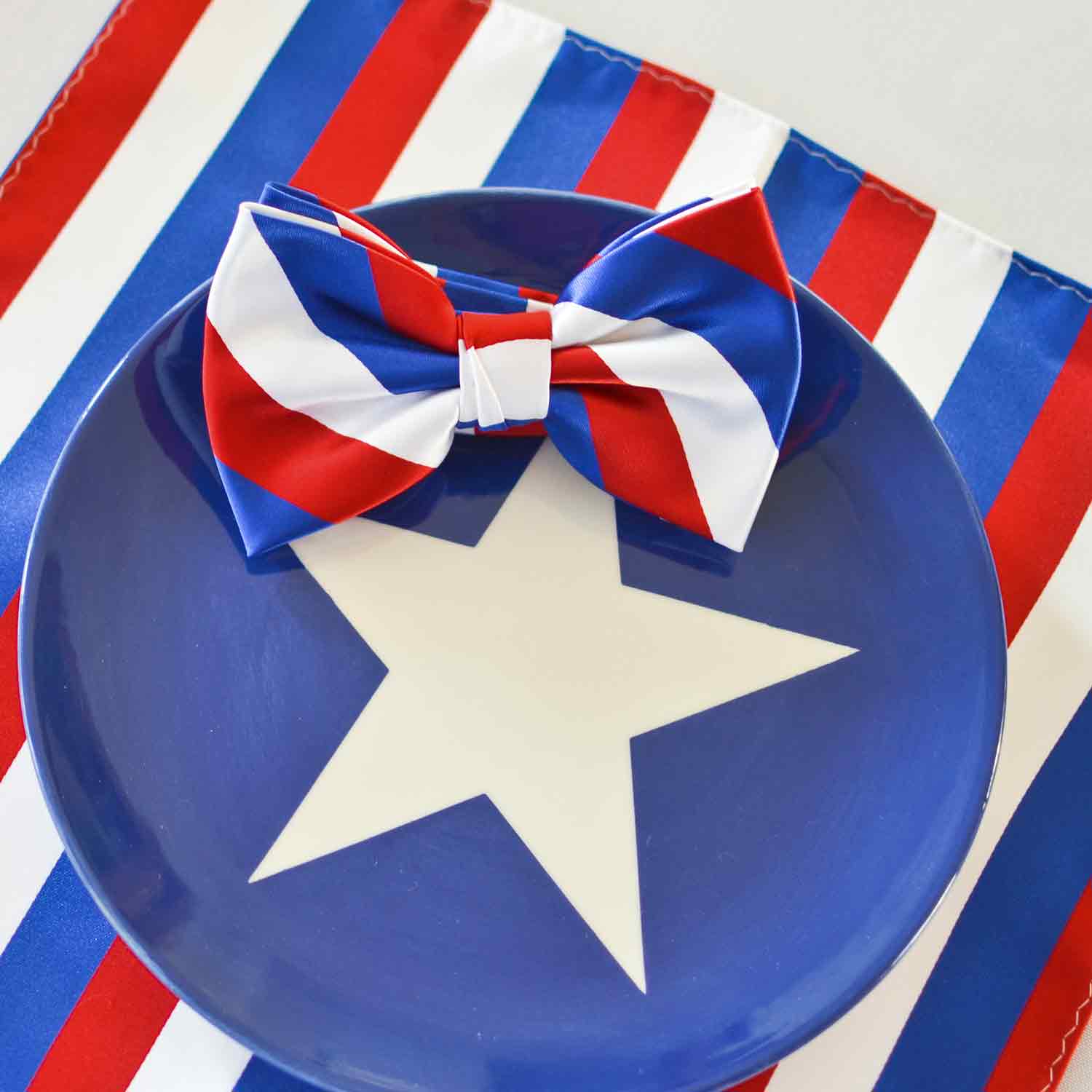 Get ready to celebrate America in style! This tri-color striped bow tie is the ultimate 4th of July statement piece. We've taken our exclusive striped bow ties to the next level by adding a third stripe, creating a bold red, white and blue combo that's perfect for showing off your patriotic spirit. Whether you're dressing solo or coordinating a group look, you can go all out with our matching socks, neckties, pocket squares and even youth sizes for the little ones.