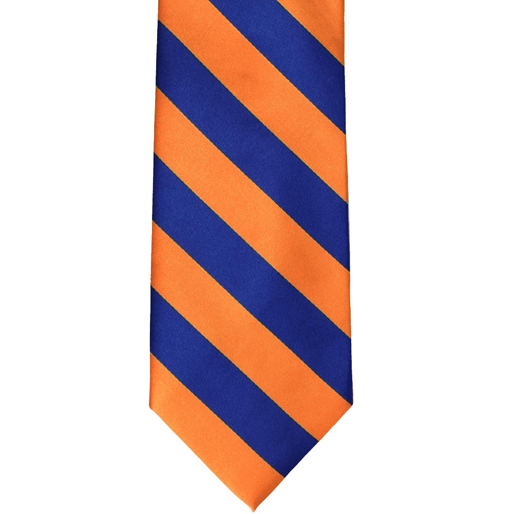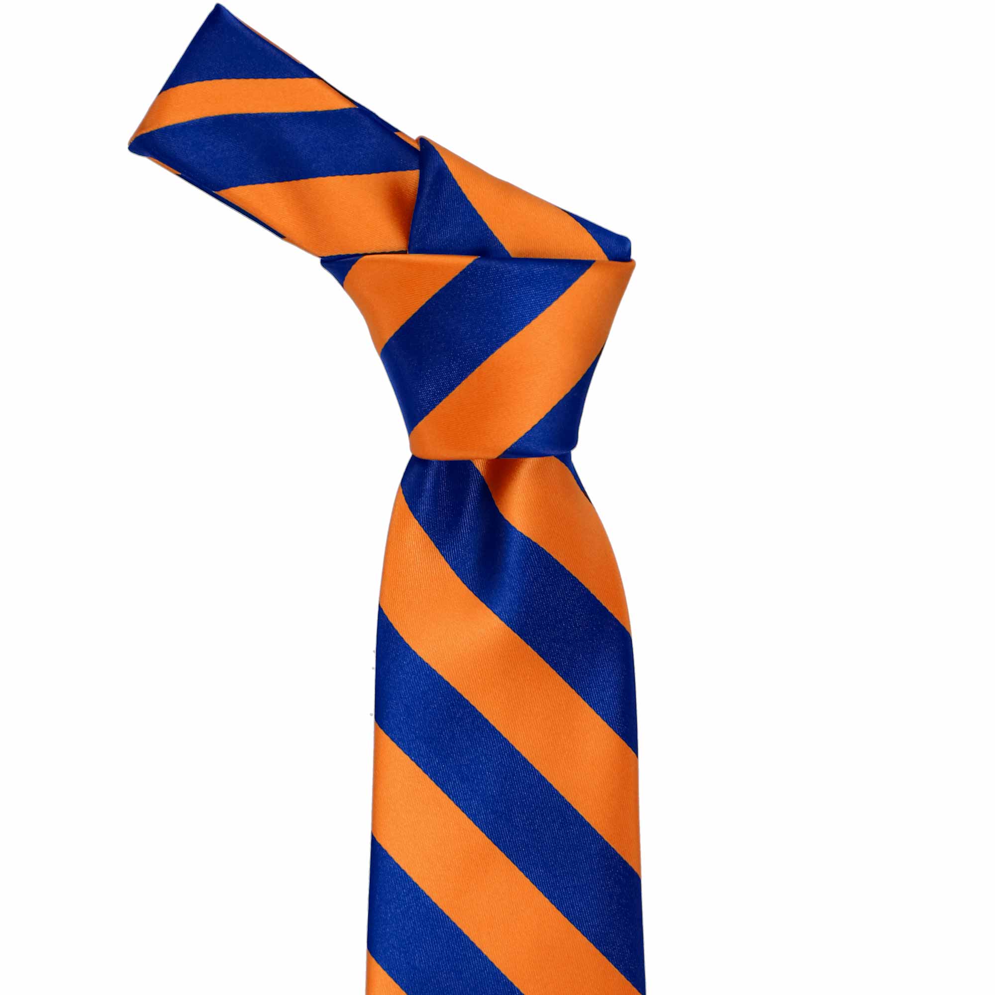 Cheer on your school or favorite team in style! This royal blue and orange striped tie is the perfect accessory to show your team spirit while keeping your look dressed up. It looks formal with a suit, but still professional with khakis. A great choice for school uniforms or matching company colors. Also available in a pre-tied bow tie, self-tie bow tie and pocket square.