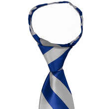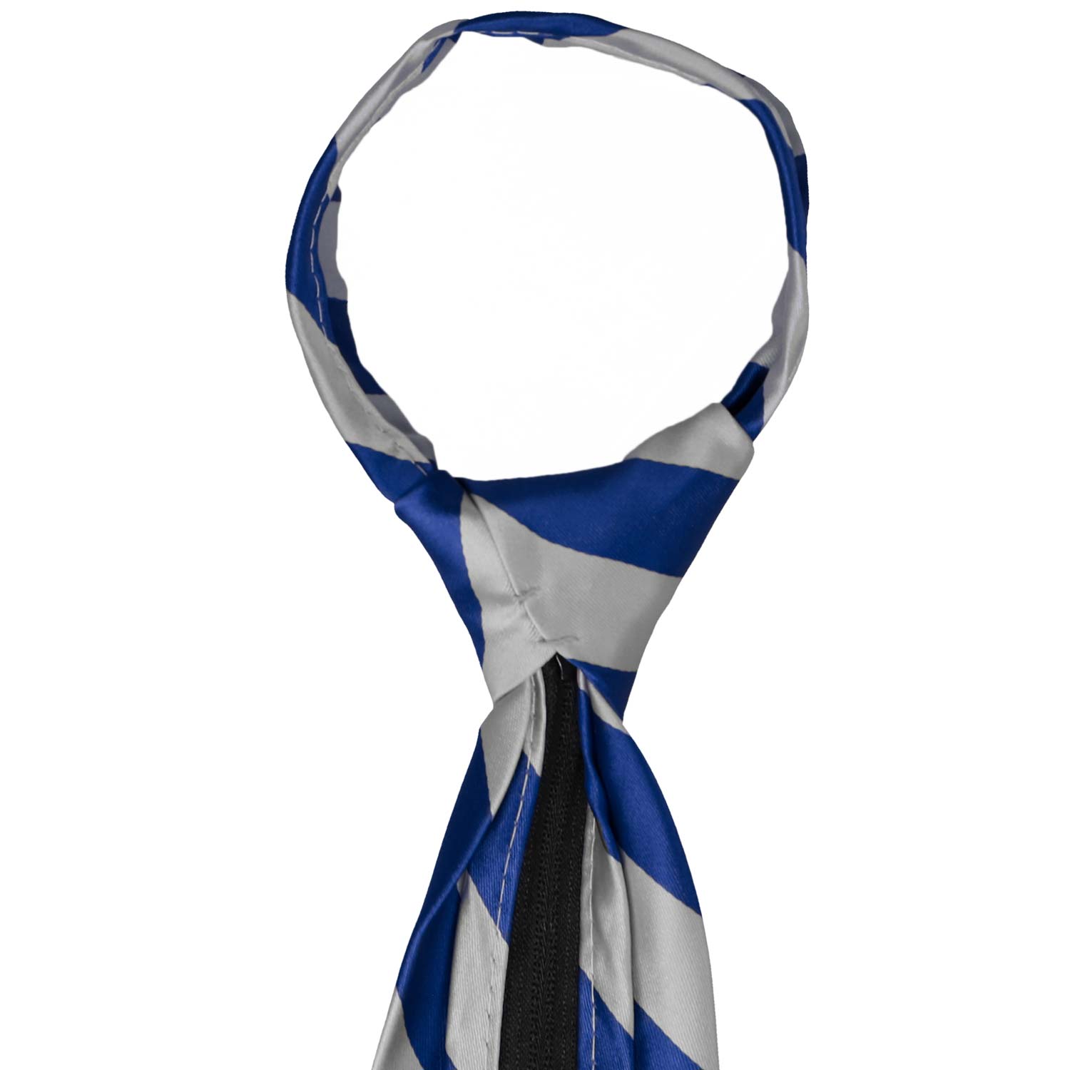 Support your school or cheer on your favorite team with a royal blue and silver striped tie. It's pre-tied and easy to use, but when worn it will look just like a standard necktie. The secret is a zipper in the tie tail that allows the collar to quickly expand and fit over the head without having to tie a knot. Available in a standard men's 20-inch length or 17-inch length for shorter men, women and teens.