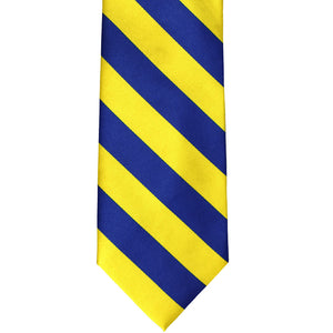 Add a cheerful touch of color to your formal or business casual attire with this royal blue and yellow striped tie. Easy to pair with your existing wardrobe, from your best navy blue suit to your favorite pair of slacks. Wear it to represent your team/school, or just because!