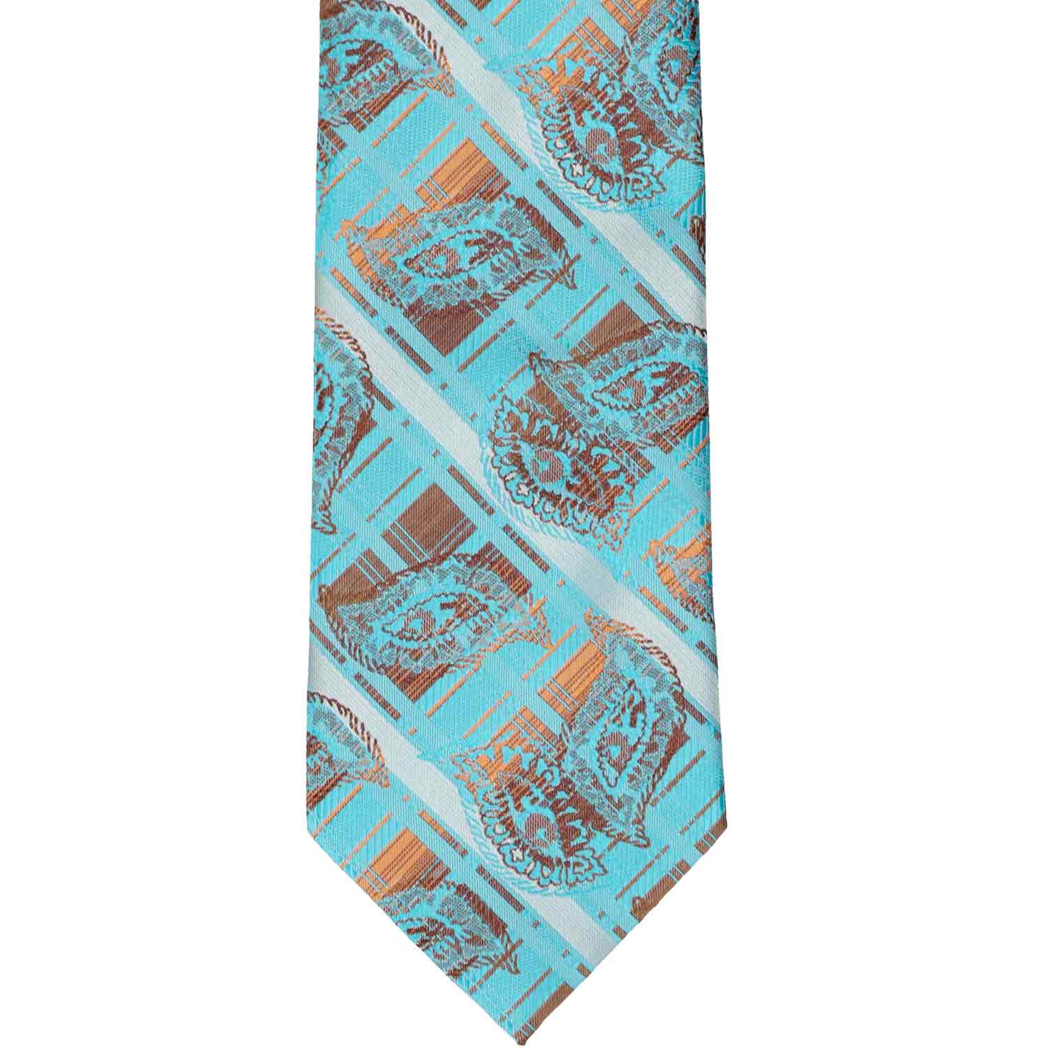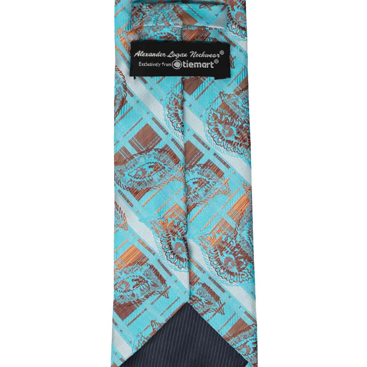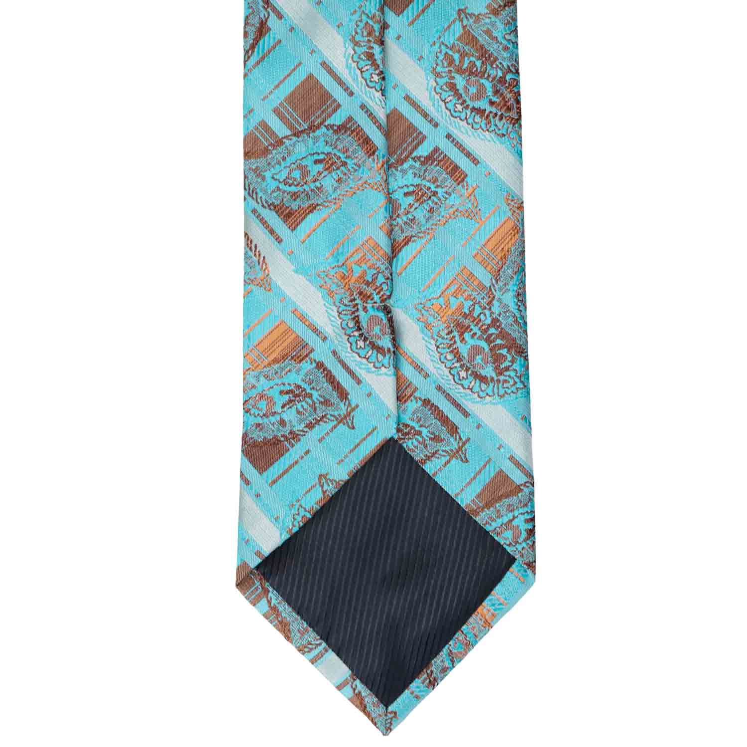The classic appeal of plaid combined with a intricate paisley print. Orange paisley pops from the plaid background of this turquoise tie. Wear this for a casual office look, or dress it up with the included matching pocket round.