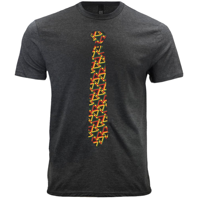 A gray t-shirt with a red, yellow and green geometric pattern necktie printed on