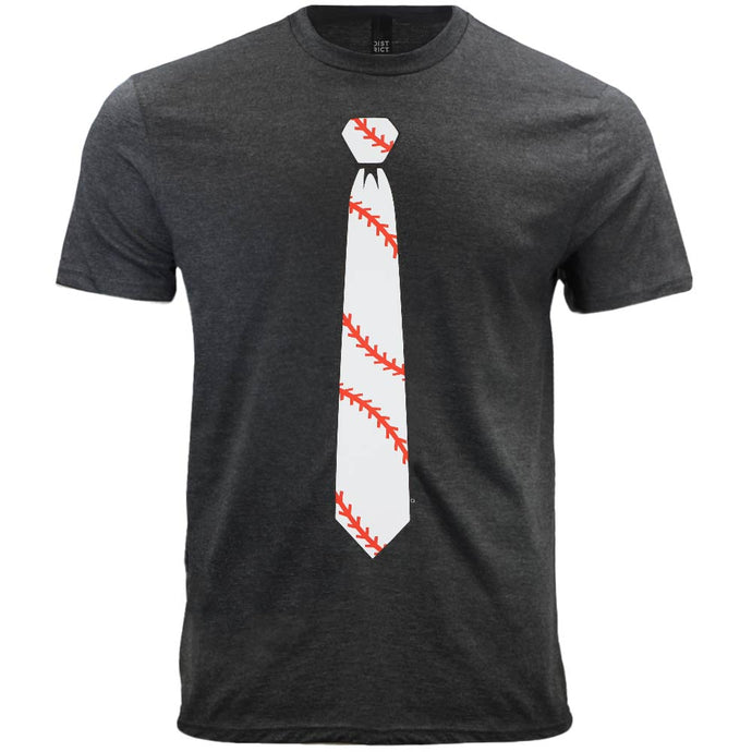 A gray t-shirt with a white and red baseball necktie design  Edit alt text