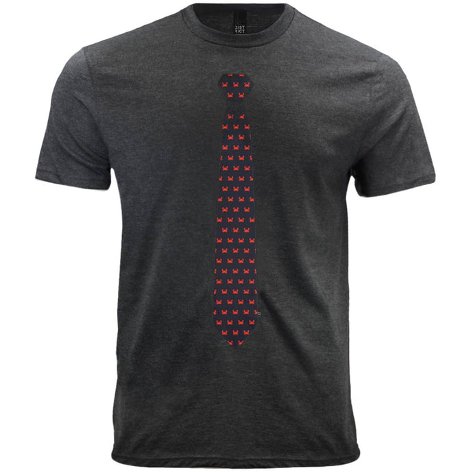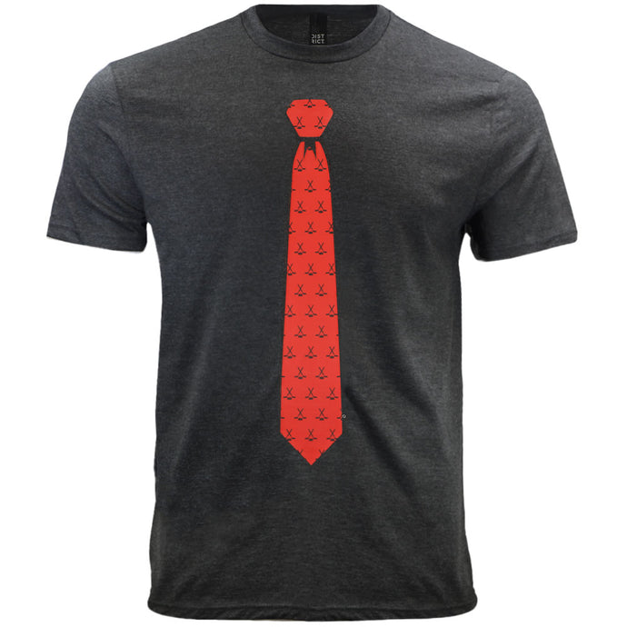 A men's gray t-shirt with a red and black hockey pattern necktie design
