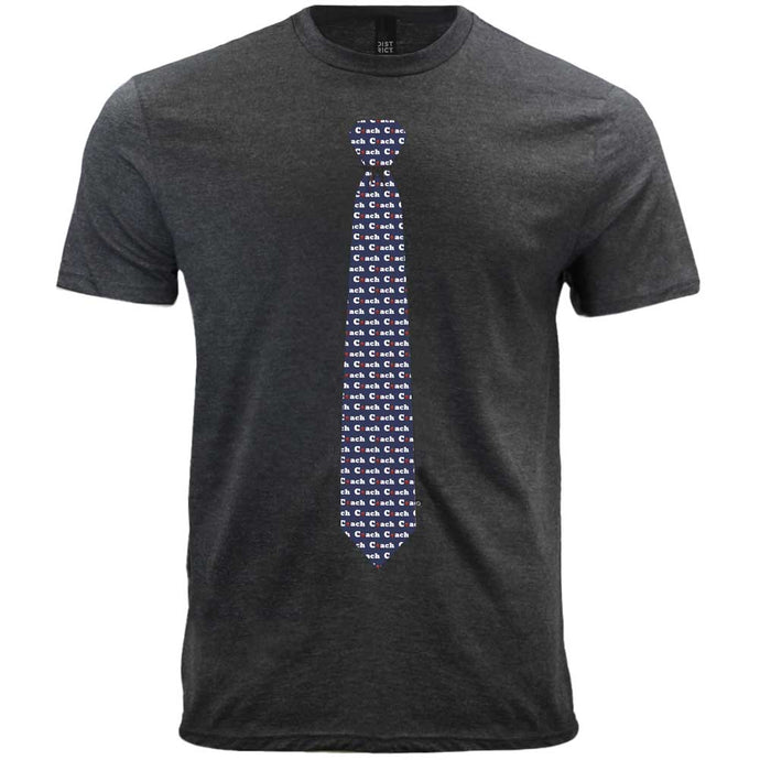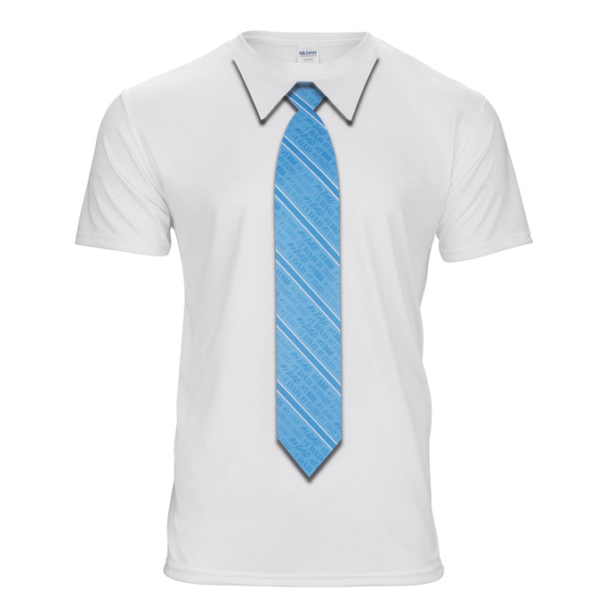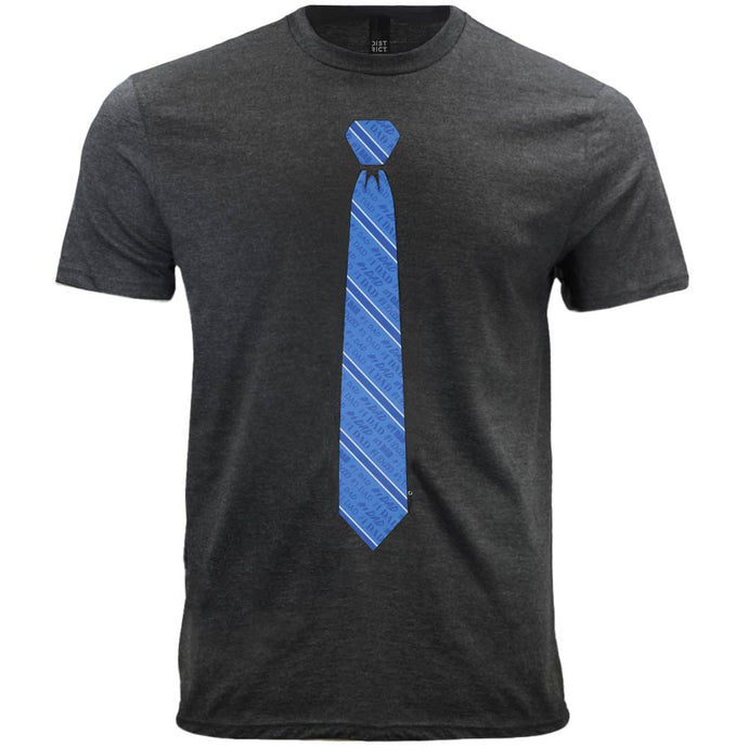 A dark blue lightning bolt necktie design on a light gray t-shirt
