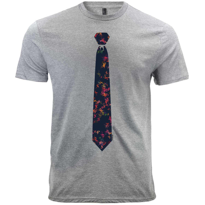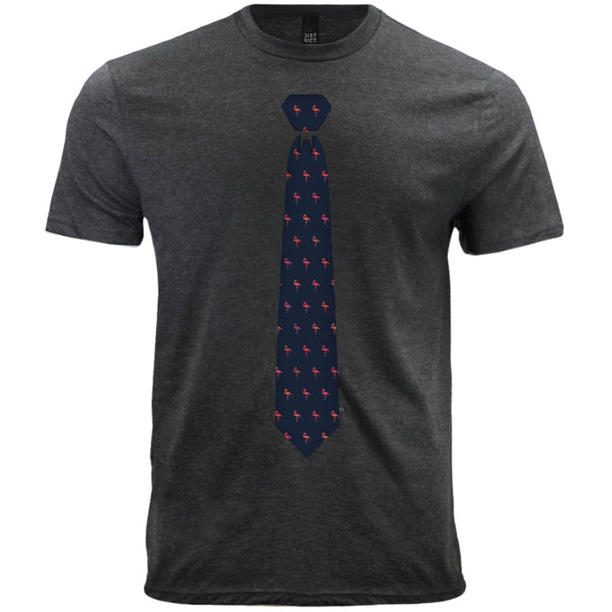 A light gray men's t-shirt with a printed dark gray flamingo necktie design