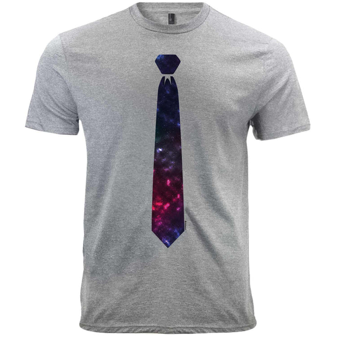 A grey men's t-shirt with a blue dad-themed striped necktie design