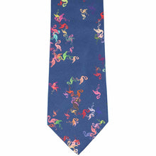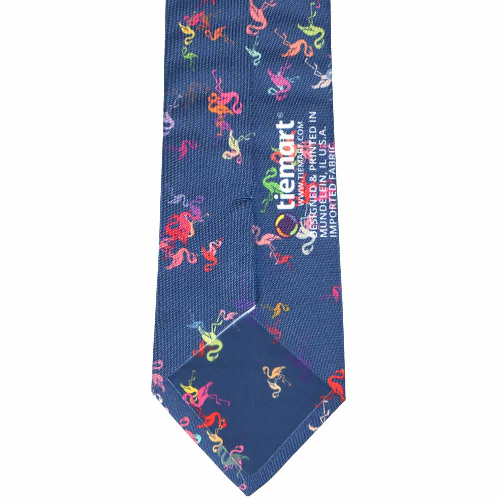 Front view dark blue tie with colorful scattered flamingos