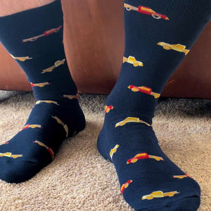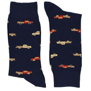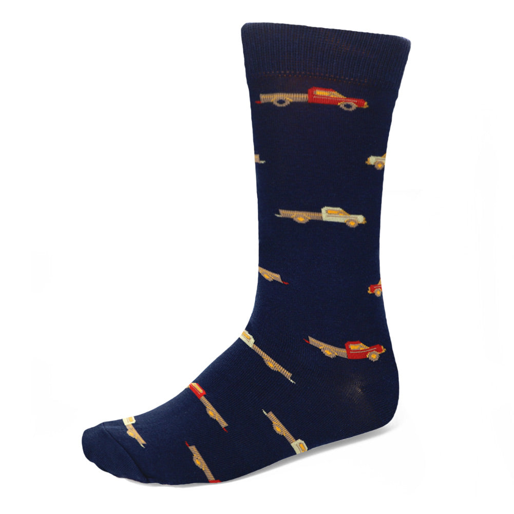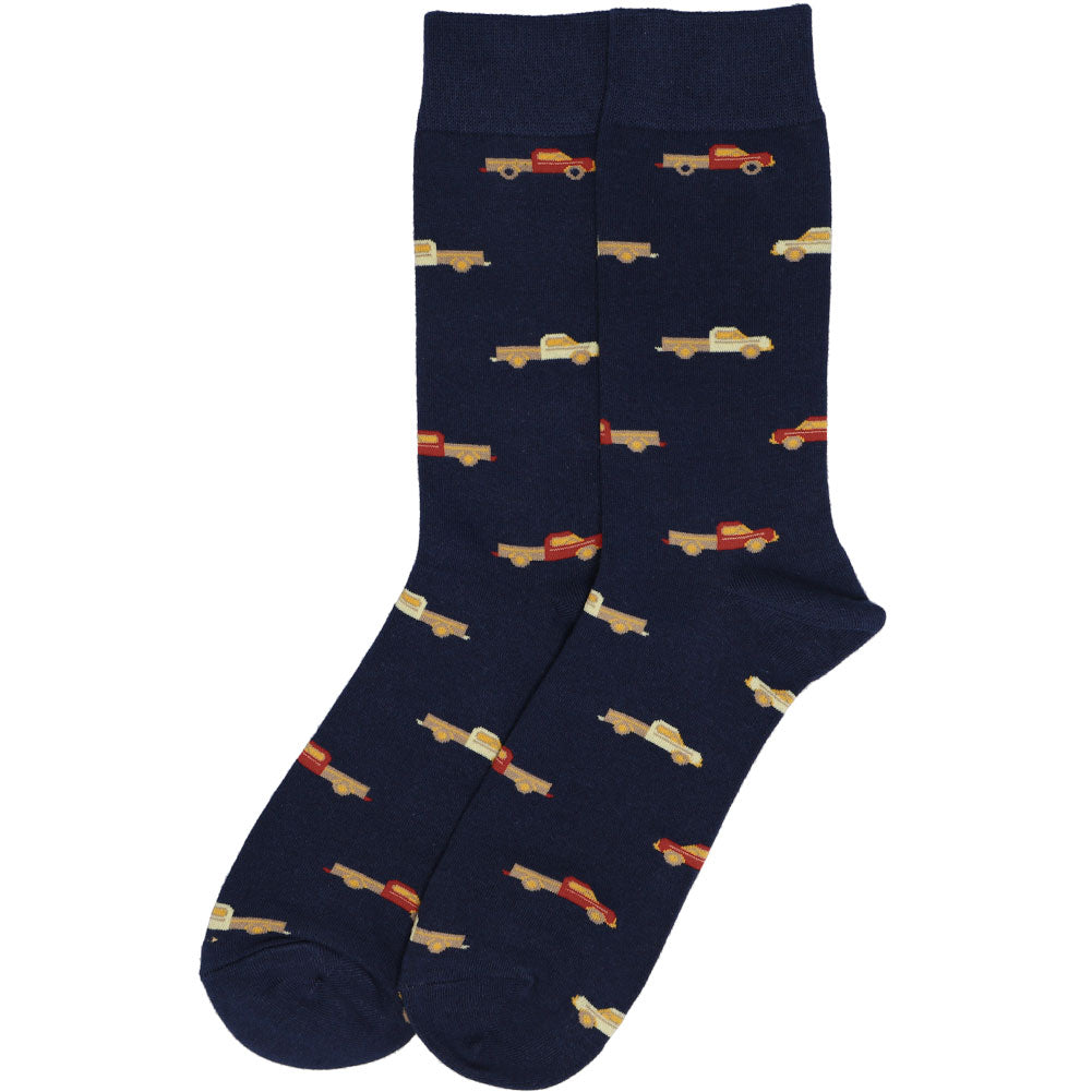 Load up your truck bed and put the pedal to the metal. These men's pickup truck socks are a real gas! They feature office-appropriate red, gray and tan pickup trucks on a navy blue background. Perfect for the hardworking man in your life.