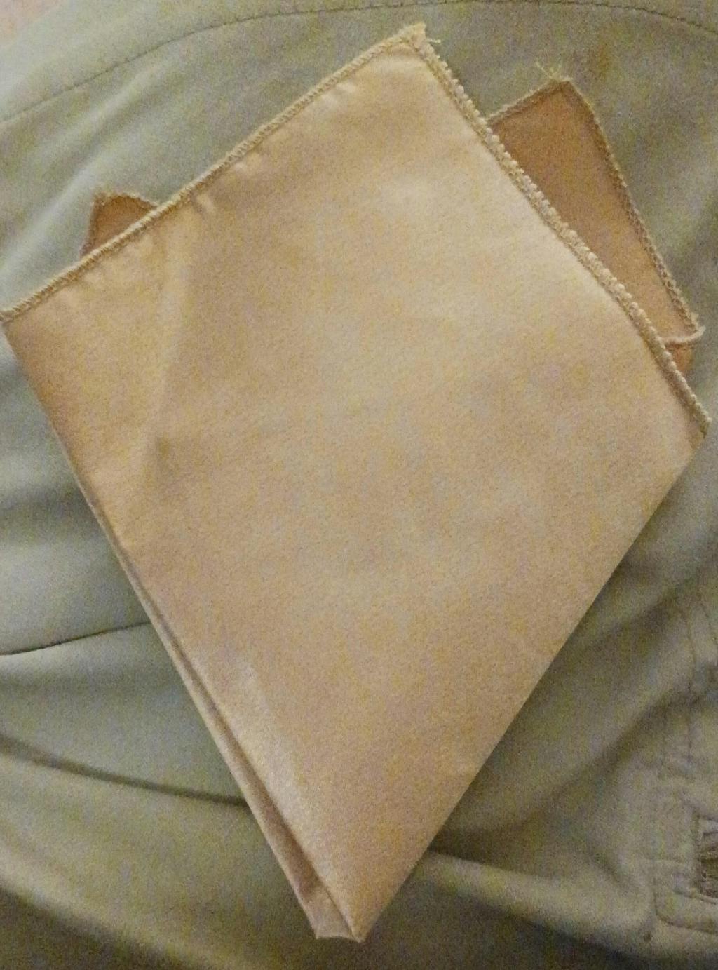 This pocket square measures a larger, 12-inches by 12-inches, which is just right for those popular peak, puff and straight folds. The material is a single layer and one-sided. While lightweight, there is some stiffness to the fabric which aids with folding. The material is finished with a light, but not too shiny, sheen.