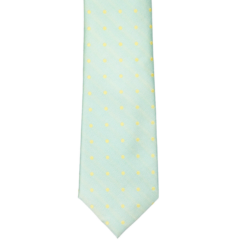 Check out this modern and stylish tie! Yellow dots are scattered across the minty blue-green background, giving it a whimsical feel. This is a great choice for wedding parties, and looks particularly handsome with those popular navy blue groomsmen suits. After the wedding, the guys can continue to wear it for work and other warm-weather occasions.