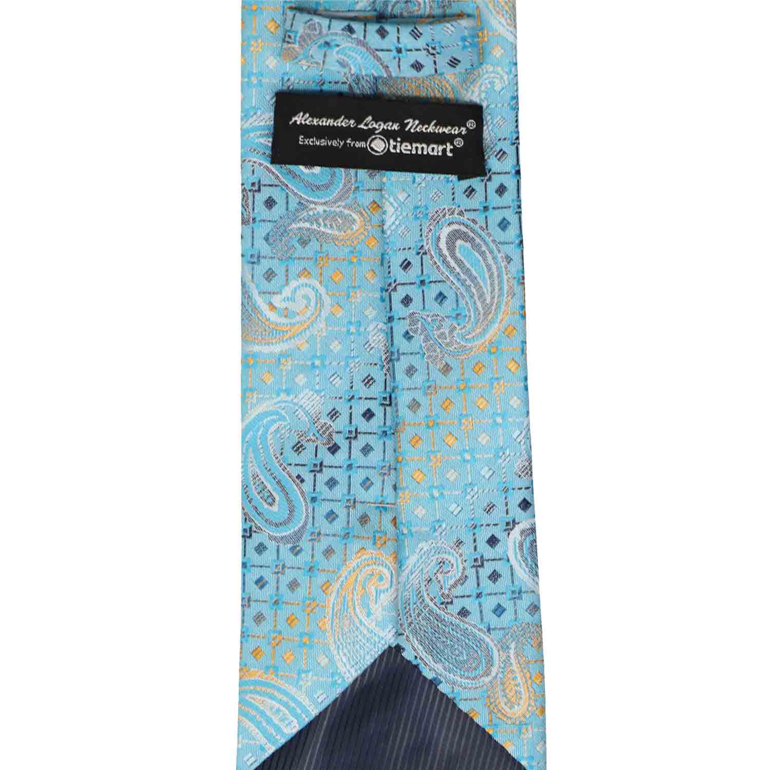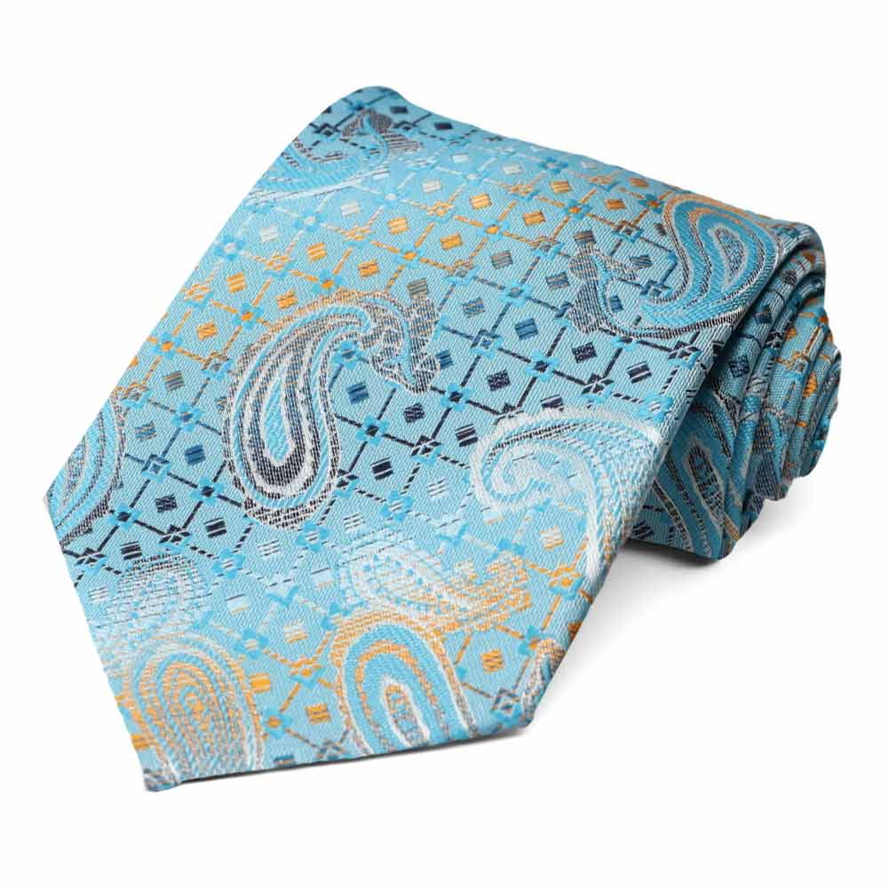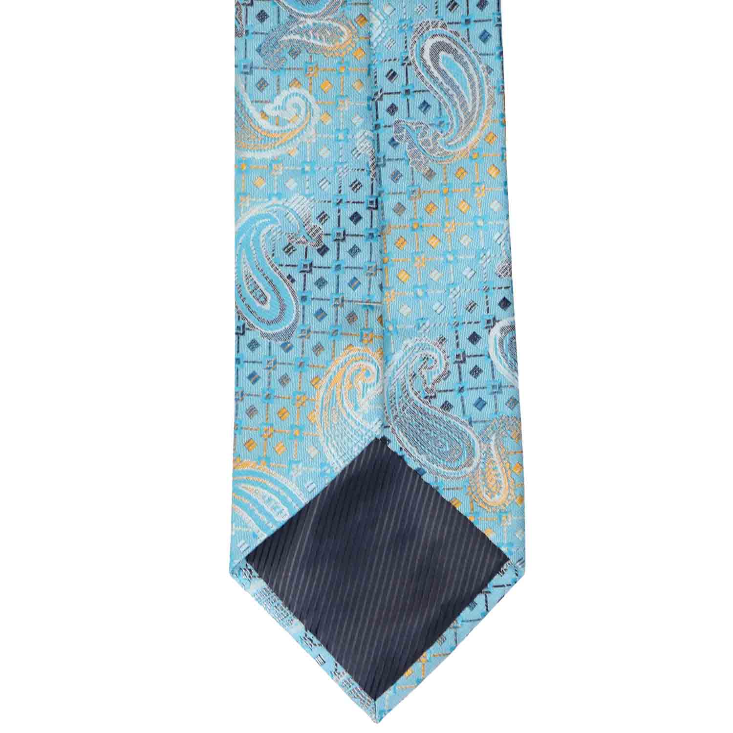 You're going to love the details in this tie. The paisley is intricate and scattered across a geometric background. The color is mainly blue, but there are some touches of orange, too. We really like this one for spring and summer.