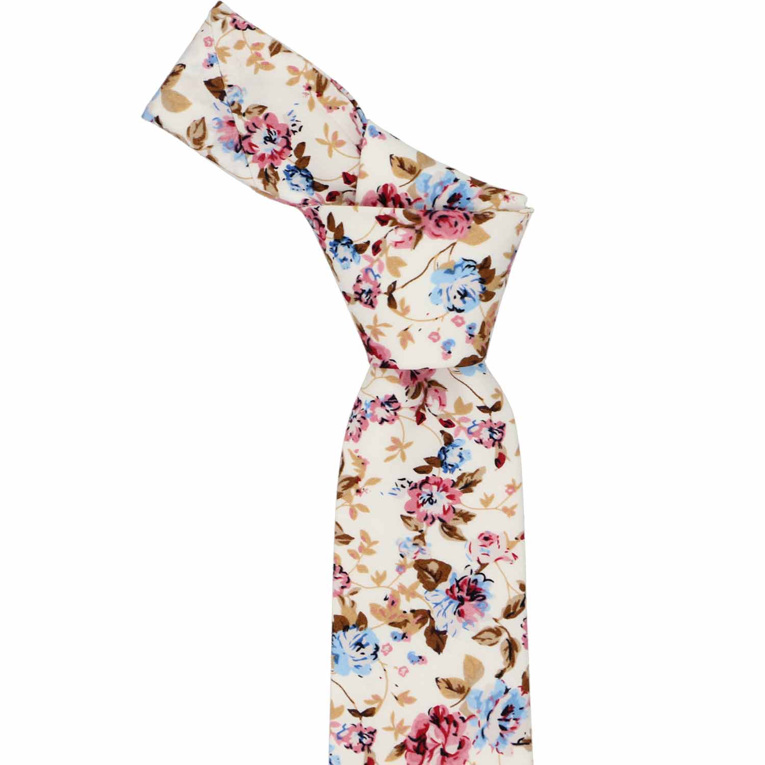This floral tie has all the right colors: Subdued dusty mauve mixed with tan and a sprinkling of light blue on a not-so-white background. This is a stunning choice for weddings or Prom. Pair it with a navy blue suit, or go for something different like tan suspenders and slacks or even a burgundy suit. The pattern comes in a bow tie, pocket square and a boys' size (sold separately), so you can mix and match tie styles among a wedding party.