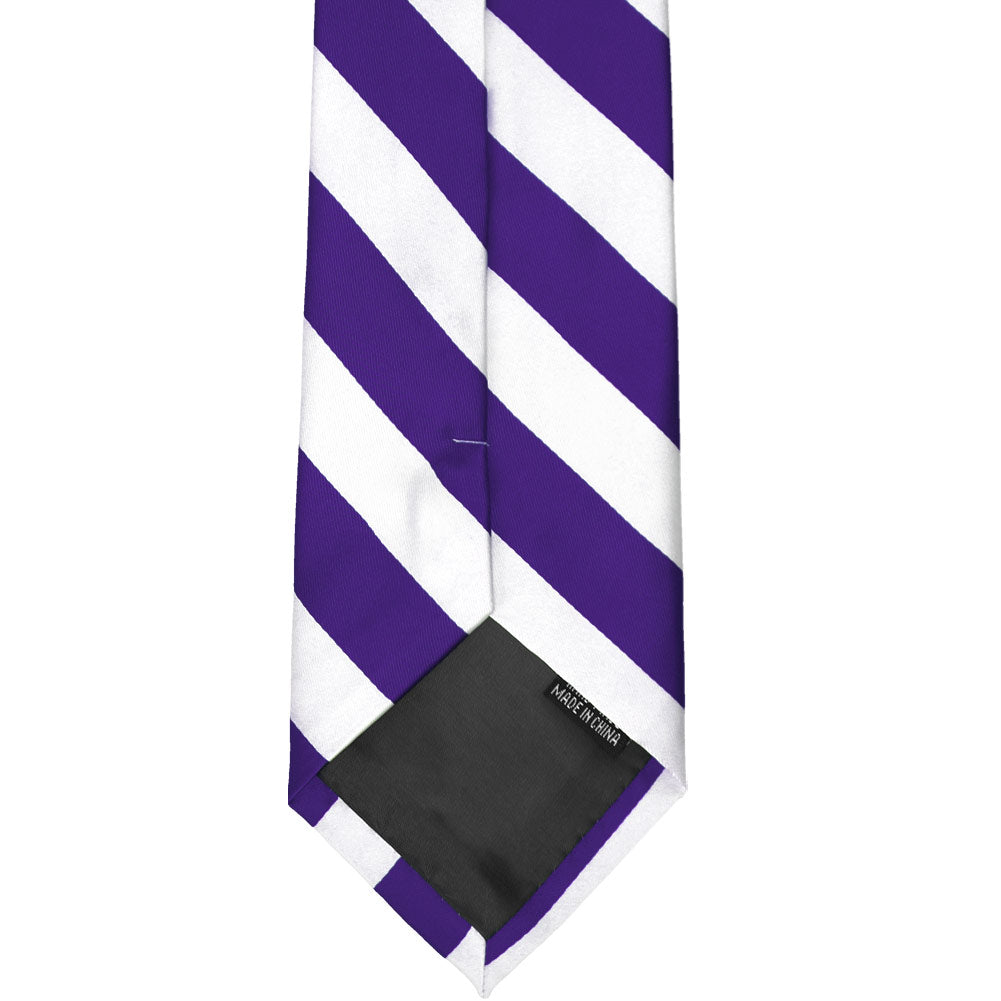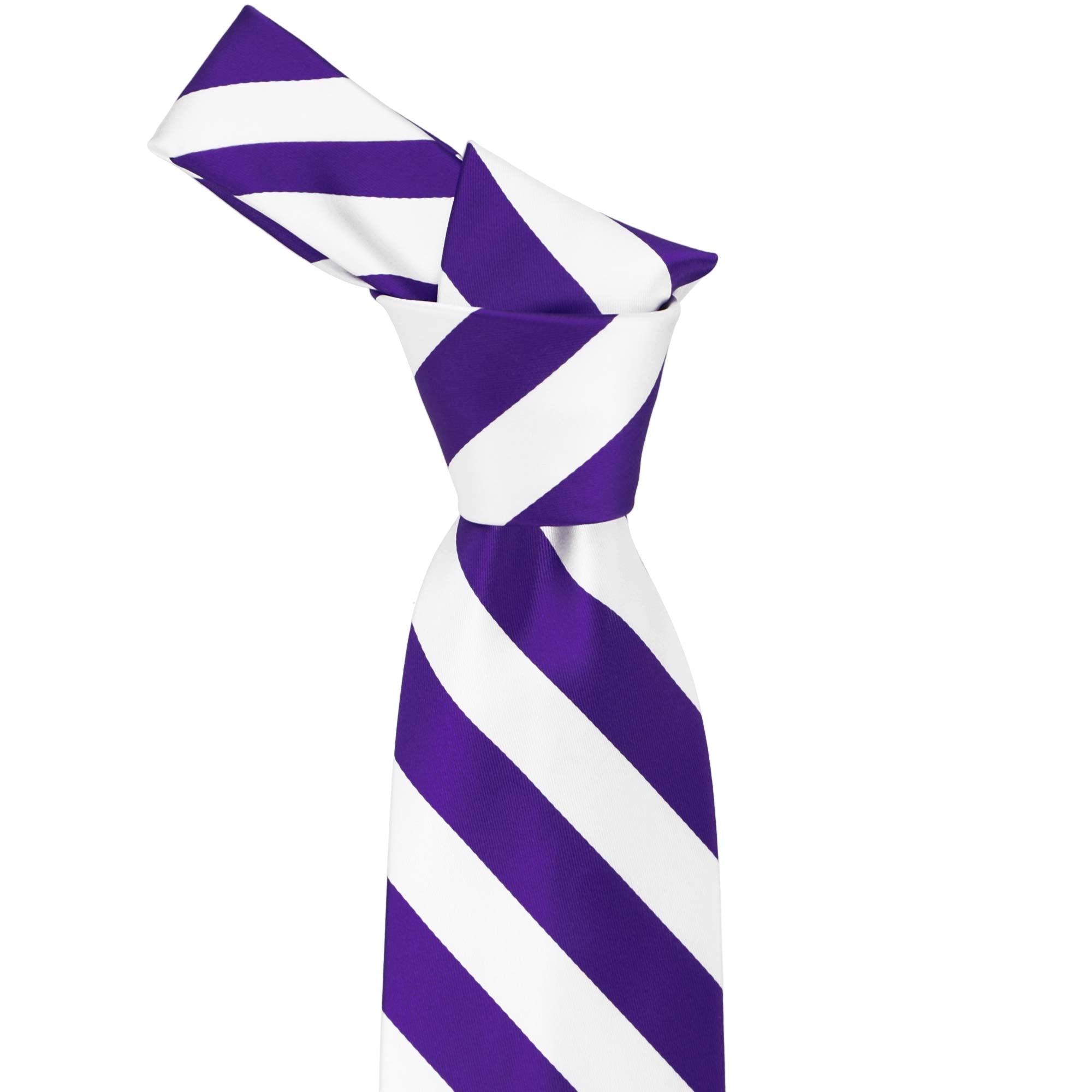 Cheer on your team or simply show off your favorite colors with a dark purple and white striped necktie. This woven striped tie is part of our exclusive (and bestselling) line of striped neckties. Made from 100% polyester microfiber. Add to your look with a matching dark purple and white pocket square.