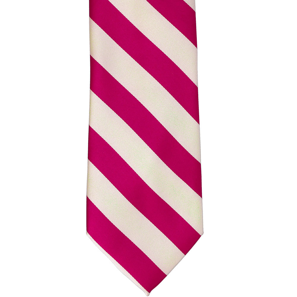 The front of a fuchsia and ivory striped tie, laid out flat