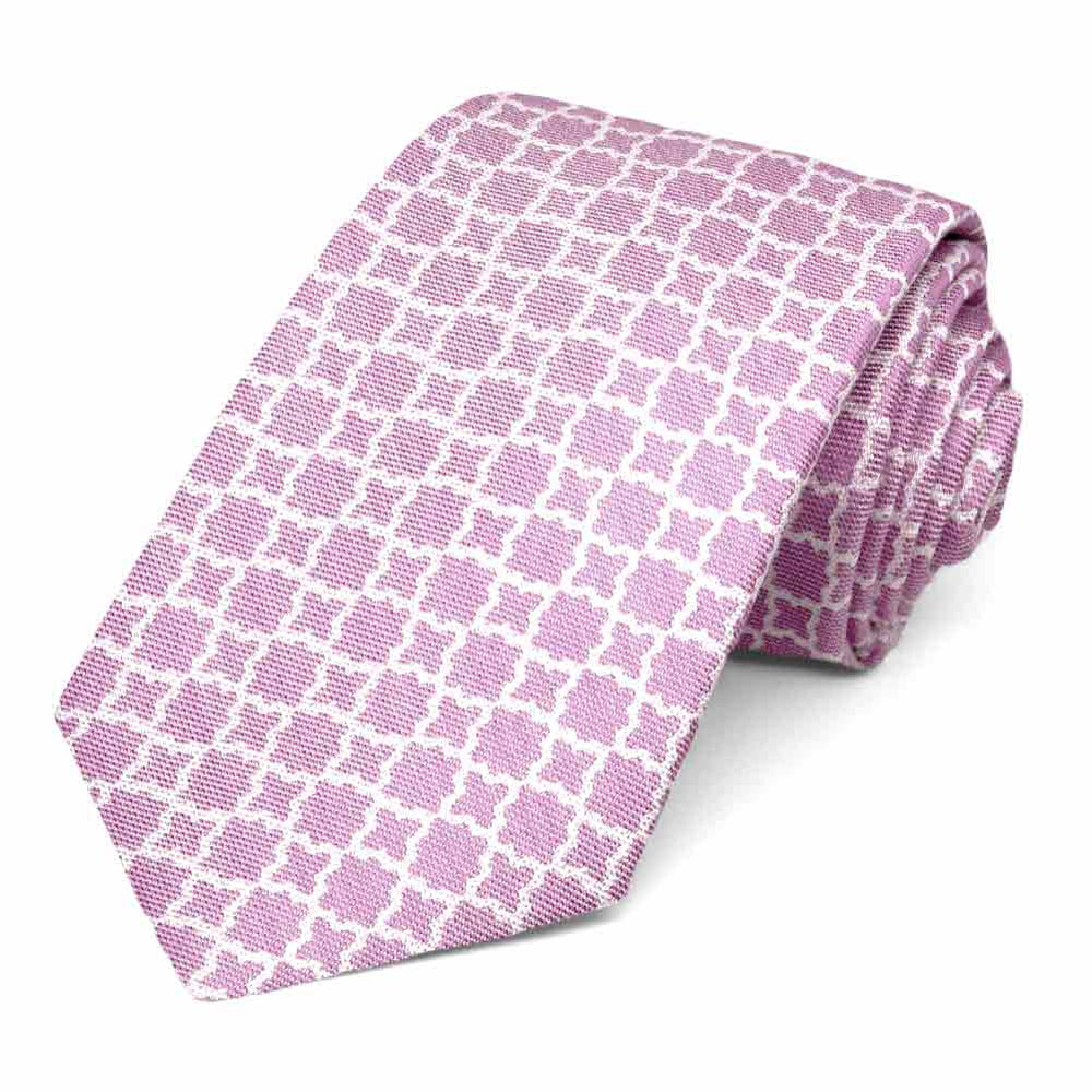Add a pop of color to your summer wardrobe with this tie. The shade of magenta is both vibrant and flattering for any occasion, from everyday to formal. While the trellis pattern is unique, it has a familiar feel to it that makes it easier to style than you might think. For those using this tie for a summer wedding, matching pocket squares are available for purchase.