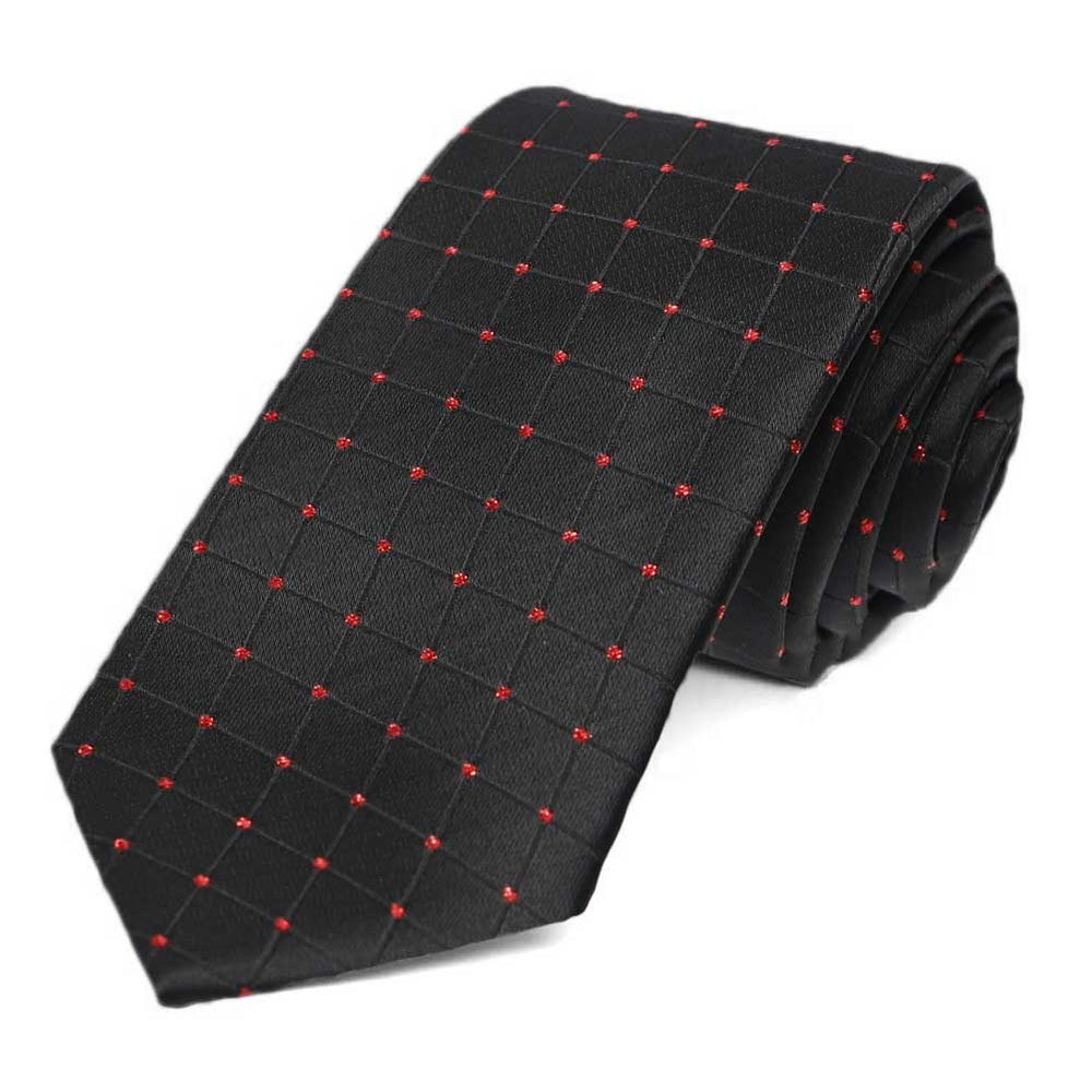 This slim black necktie features a red grid design woven with Lurex threads for a shiny metallic look. This one makes it easy to go from a day at the office to a night out. A matching pocket square is included for formal occasions.