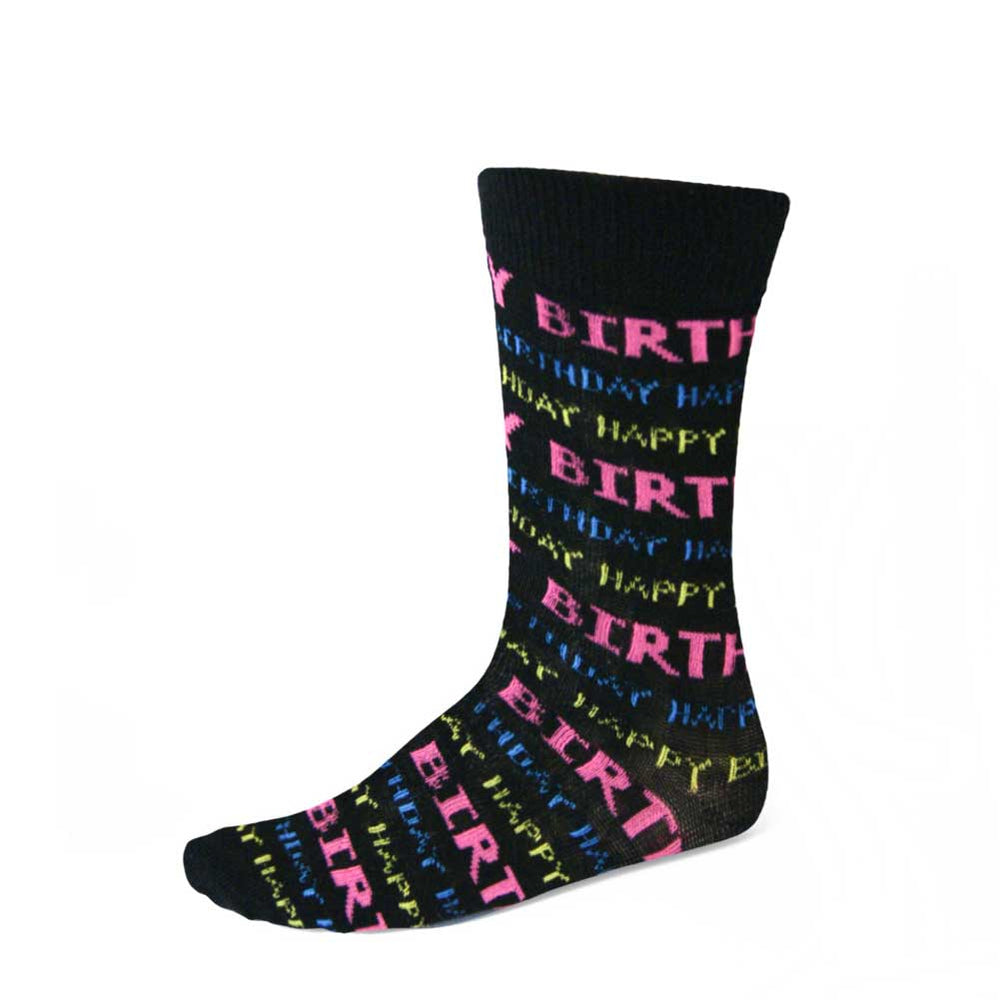Wish her a happy birthday with a pair of novelty crew socks. They feature a black background with a pink, blue and yellow "Happy Birthday" script repeated all over the socks.