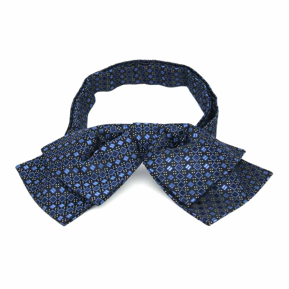 Blue and black square pattern floppy bow tie, front view to show pattern