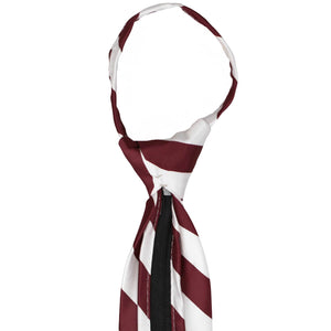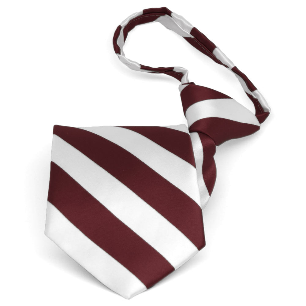 Support your school or cheer on your favorite team with a burgundy and white striped tie. It's pre-tied and easy to use, but when worn it will look just like a standard necktie. The secret is a zipper in the tie tail that allows the collar to quickly expand and fit over the head without having to tie a knot. Available in a standard men's 20-inch length or 17-inch length for shorter men, women and teens.