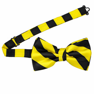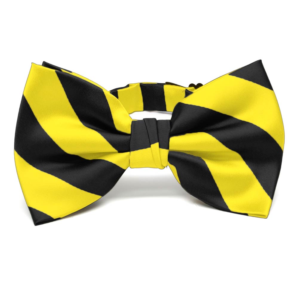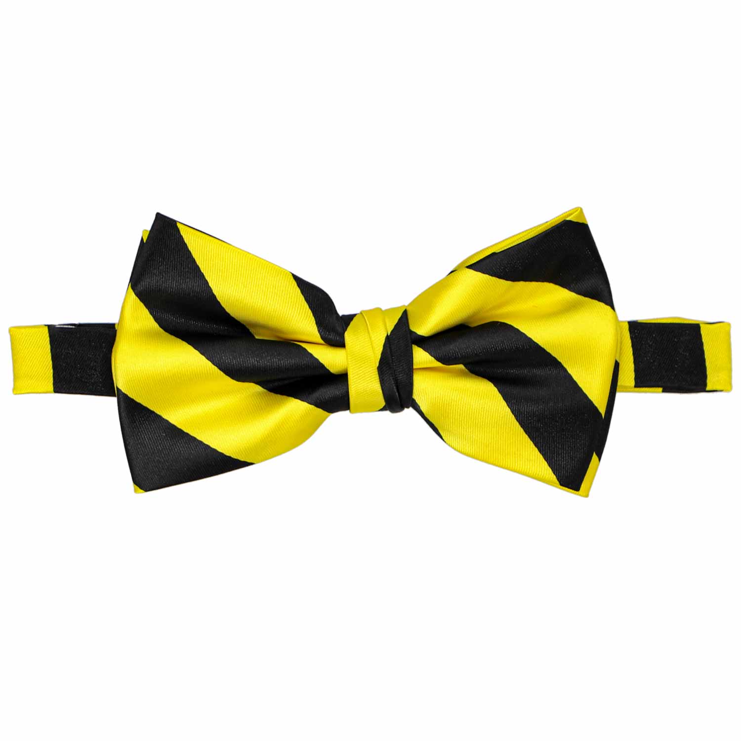 This yellow and black striped bow tie features a pre-tied, band collar that expands to fit neck sizes up to 19-inches. Made from all polyester microfiber, it is designed to match our bestselling men's yellow and black striped tie. Matching skinny ties, boys' ties and pocket squares are available for purchase.