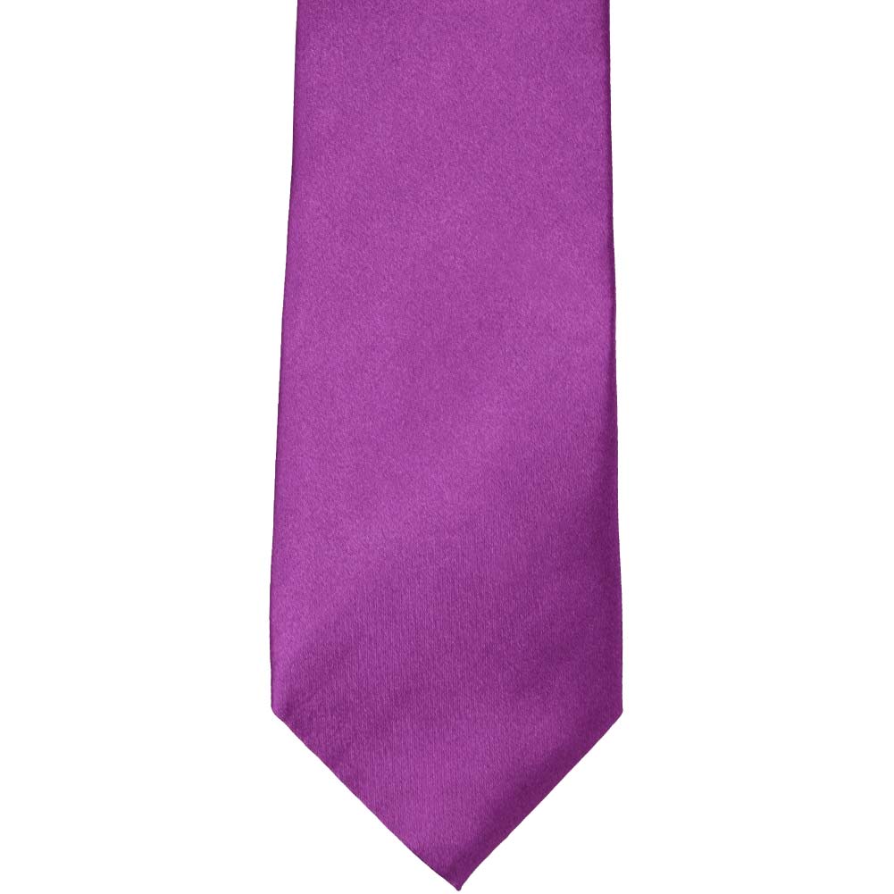 This dark orchid solid color zipper tie is pre-tied and easy to use. When worn, it will look like a standard necktie. However, a zipper in the tie tail allows the collar to quickly expand and fit over the head without having to tie a knot. Available in a men's 20-inch length. These pre-tied ties are popular for individual use, but are also great for creating a uniform look among your group or staff. Add a matching pocket square for a refined look.
