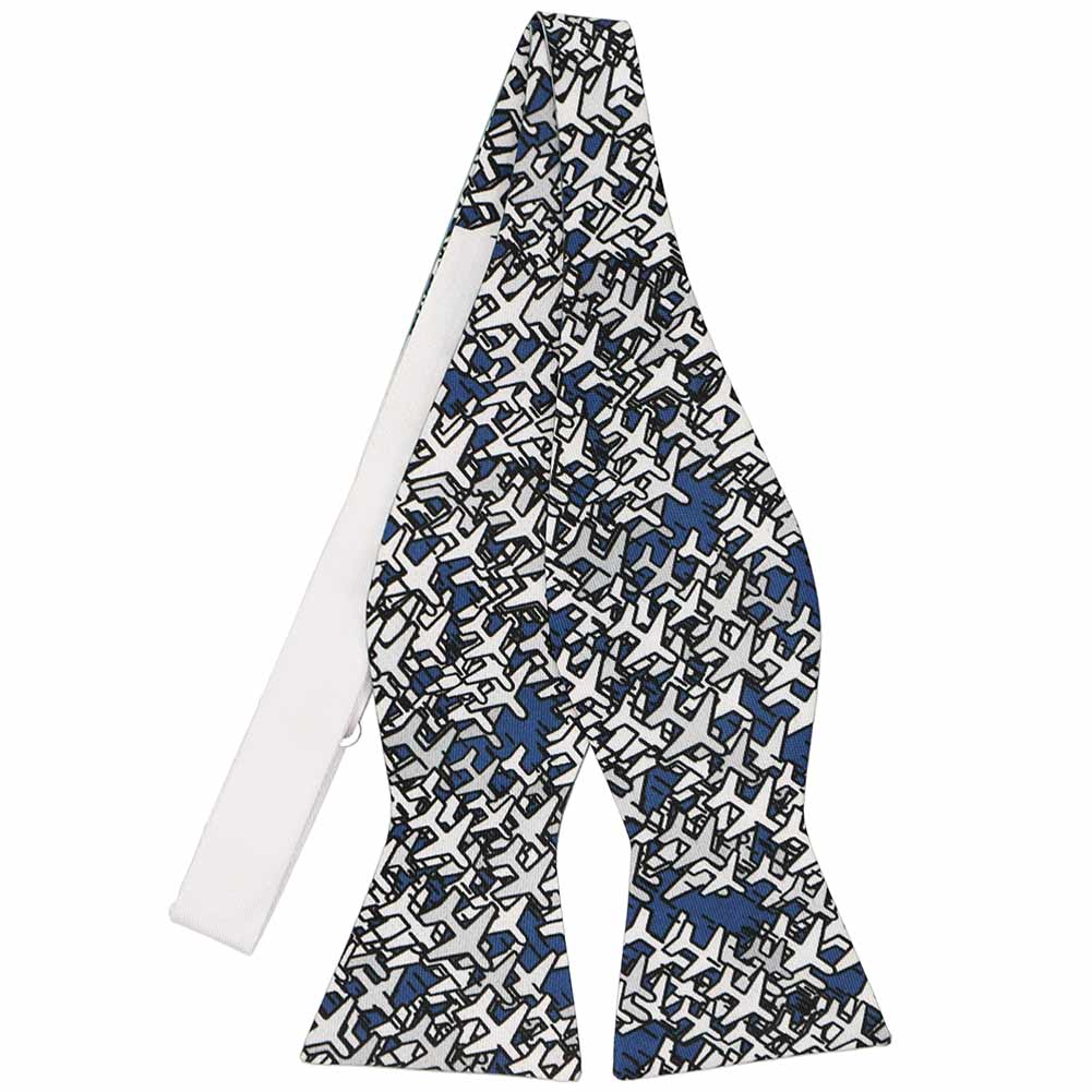 Your outfit will be fly when you add this airplane-themed self-tie bow tie to your favorite navy blue or gray suit. White and gray passenger planes soar across the dark blue bow for a pattern that's subtle enough for the office (or the cockpit). To elevate your look even higher, add the matching pocket square and a pair of our coordinating airplane socks (available for purchase).
