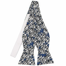 This bow tie is designed, printed and dyed at our Mundelein, Illinois warehouse. The design is printed and permanently pressed directly onto a solid white self-tie bow tie via dye sublimation. (This is not an embroidered or woven bow tie.)