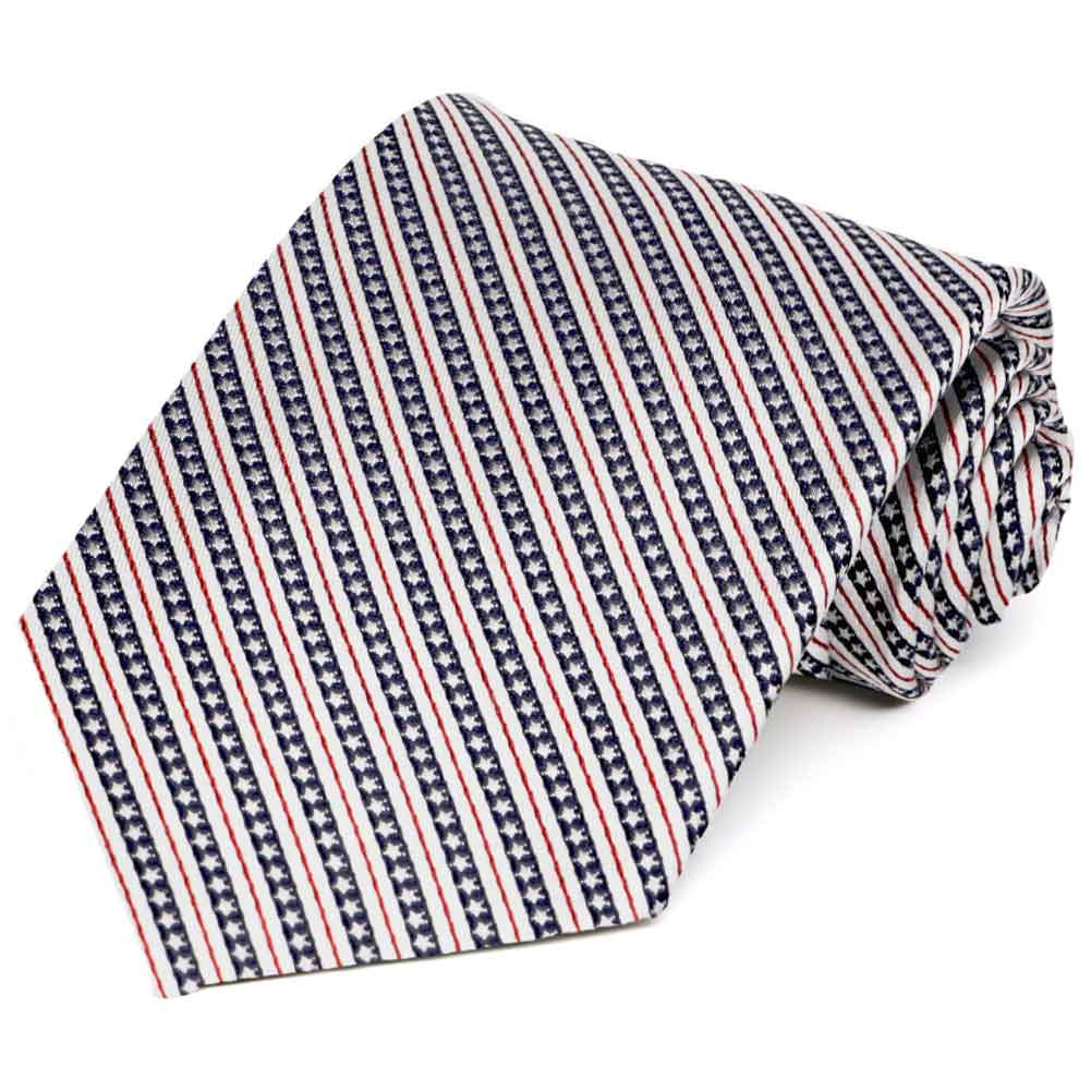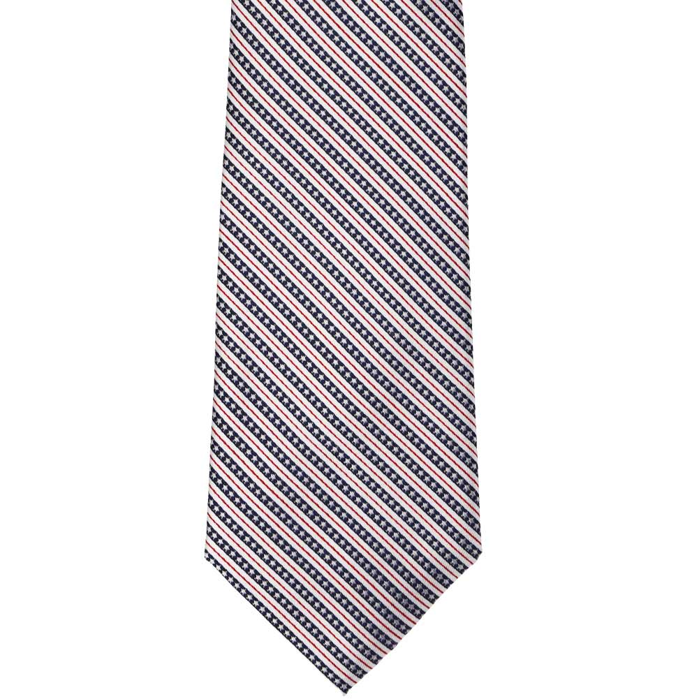 Celebrate the USA in this red, white and (navy) blue stars and stripes necktie. We kept the scale of the pattern small, so you can wear it to the office or an upscale Fourth of July celebration. This tie will go with just about anything you pair it with, from a sleek suit to a sport coat and khakis. Finish your look with our American flag tie bar and red and navy blue argyle socks. We really like this combo together.