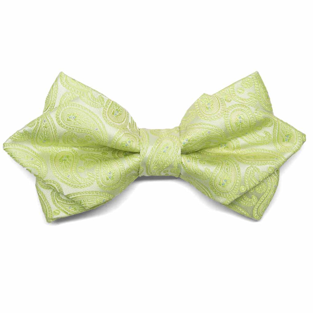 Embrace the season with this vibrant, apple green paisley diamond tip bow tie, offering a refreshing burst of color to enhance any outfit. Whether you’re uniting groomsmen with bridesmaids, complementing your Prom date, or adding a dash of personality to your office attire, this bow tie is up to the task. Available in boys' sizes, it's an excellent choice for creating a coordinated family look for photos. Combine it with your favorite suit to effortlessly brighten up your wardrobe with a touch of springtime flair!