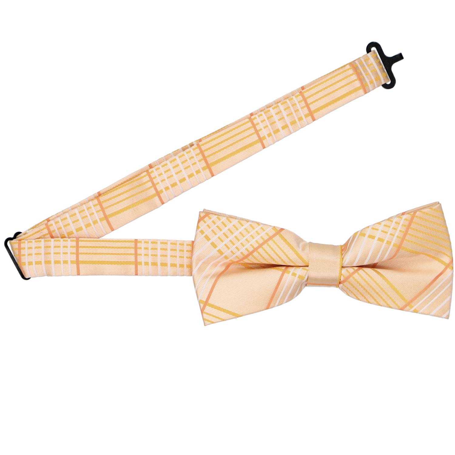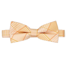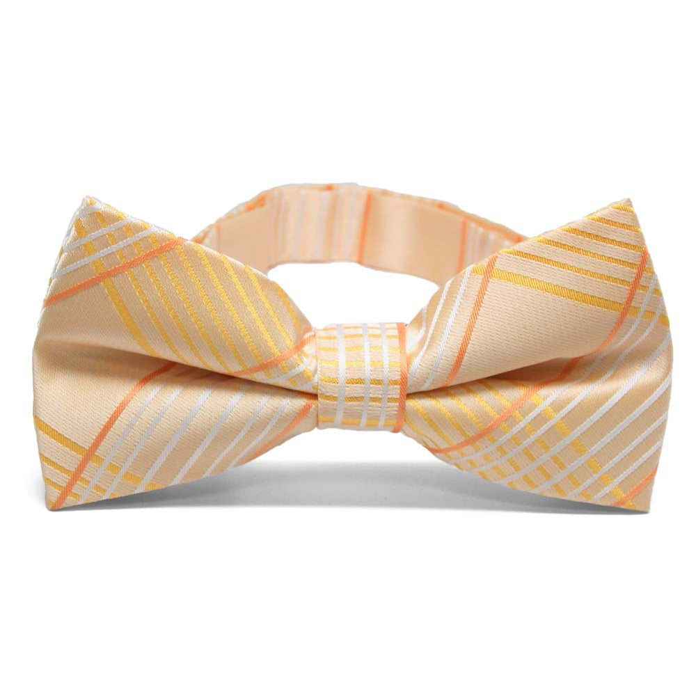 Embrace the arrival of warm weather with this light orange plaid band collar bow tie. Its large-scale pattern strikes the perfect balance—bold yet tasteful—with subtle hints of yellow and white that make it ideal for Easter celebrations or your wedding day. Pair it with a crisp white button-down, tan slacks, and suspenders for a relaxed beach wedding, keep it office-casual with khakis, or elevate your look with a navy blue suit.