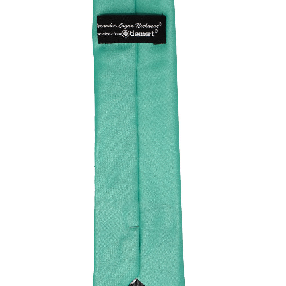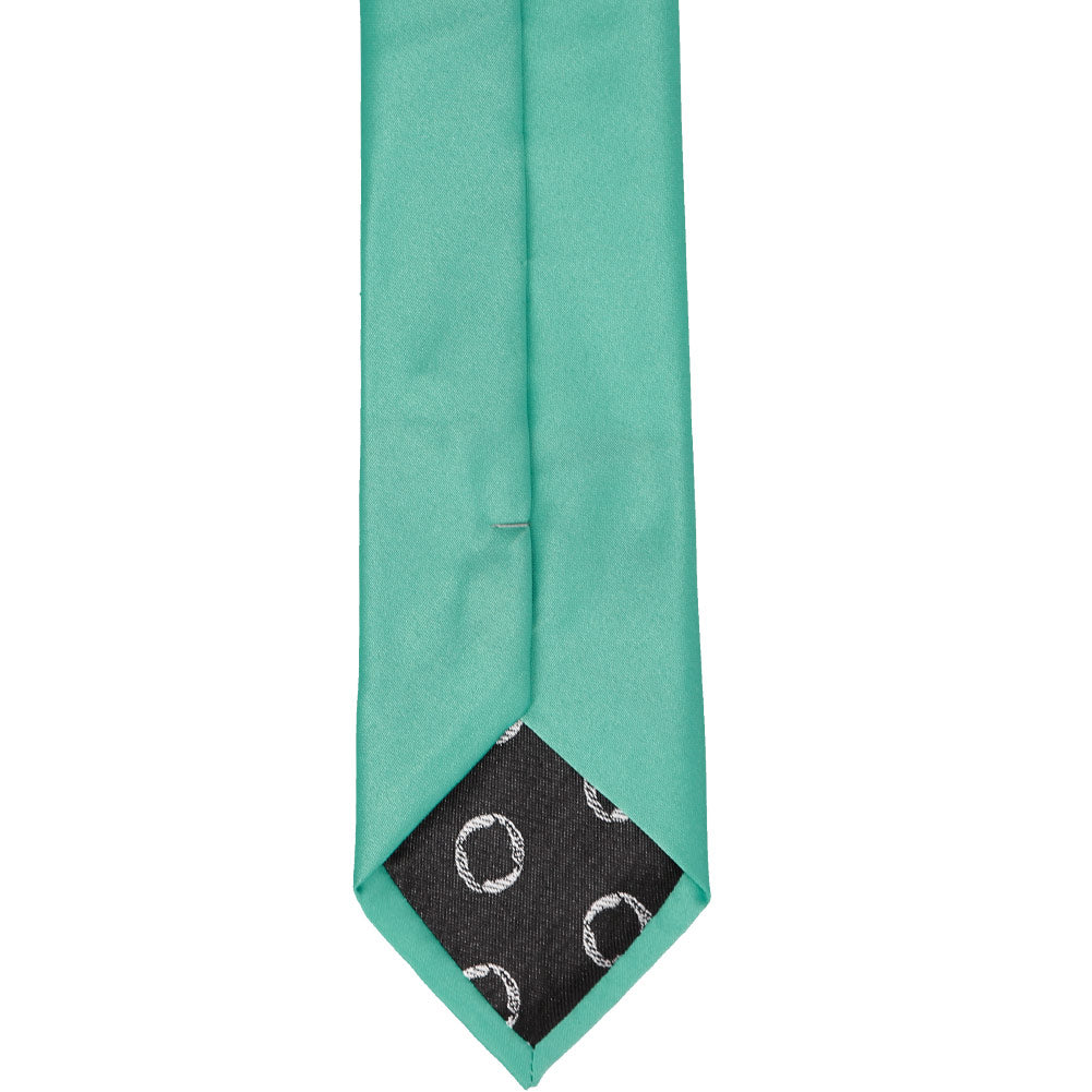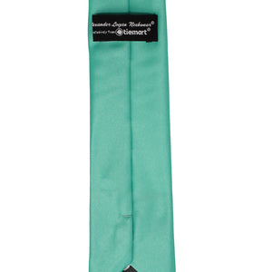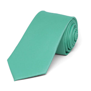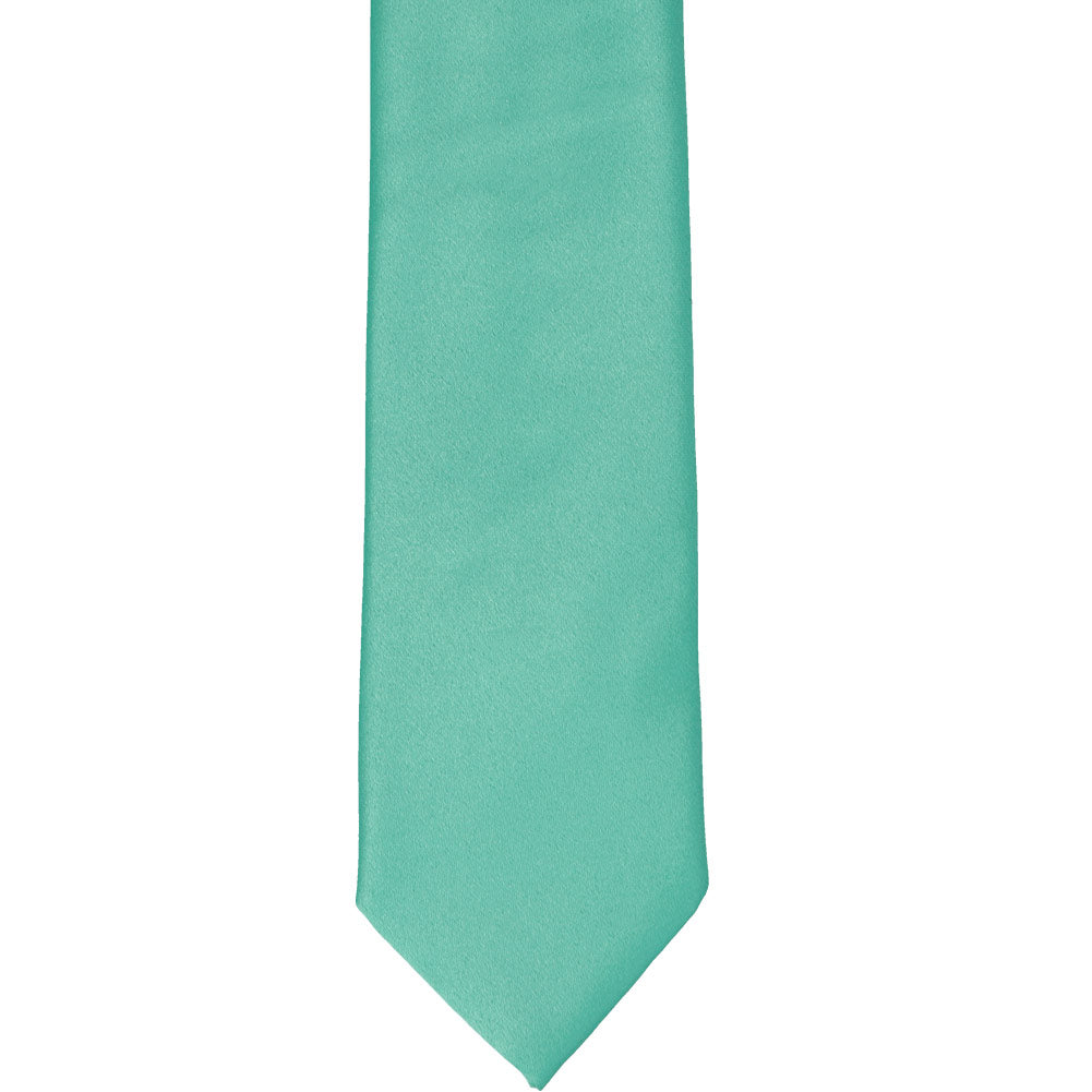 This aquamarine slim necktie provides a subtly trendy look without going too skinny. The approximate 2.5-inch width measures 0.5-inches wider than today's ultra-trendy skinny ties, but about 1-inch skinnier than a traditional men's tie. The in-between width makes it a popular necktie for fashionably outfitting a large group of different sized adults or teens.