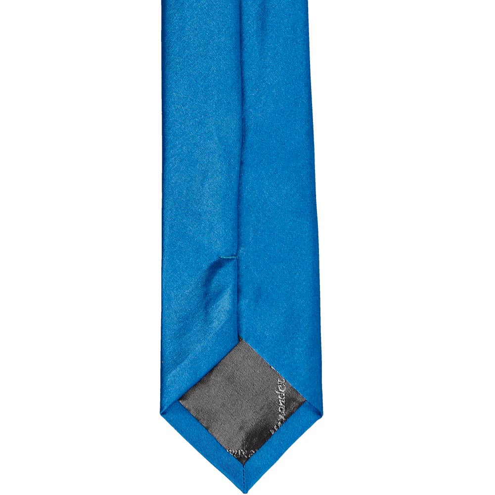 This azure blue slim necktie provides a subtly trendy look without going too skinny. The approximate 2.5-inch width measures 0.5-inches wider than today's ultra-trendy skinny ties, but about 1-inch skinnier than a traditional men's tie. The in-between width makes it a popular necktie for fashionably outfitting a large group of different sized adults or teens.