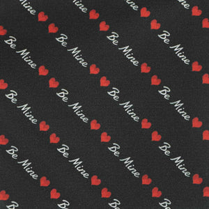 Tell them they're the only one for you without saying a word. This "Be Mine" bow tie will make your intentions known in the most stylish way possible. The self-tie bow tie features alternating red hearts and white script on a black background. Matching ties and pocket squares are also available.