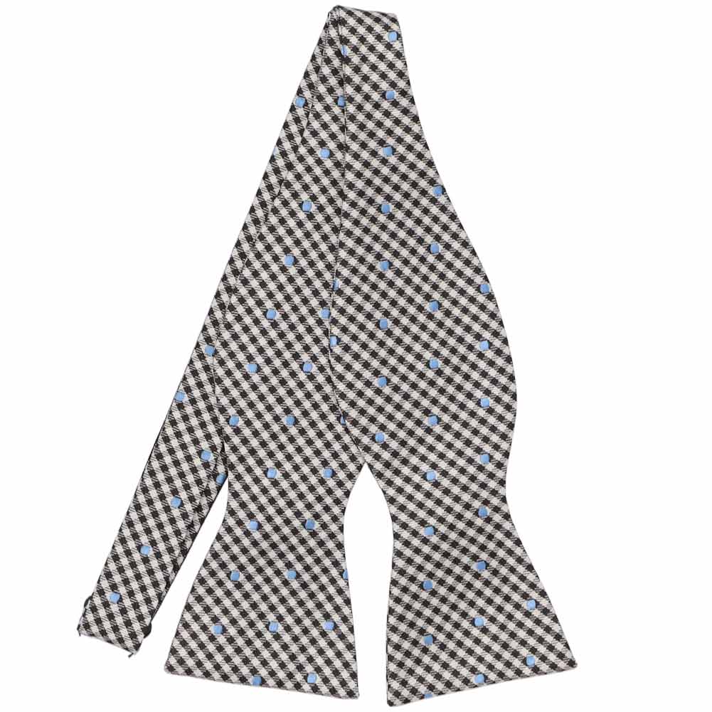 You're going to love the tiny details of this classic gingham bow tie. Black and off white are a perfect combination for formal wear, and this bow keeps it fun with the addition of woven powder blue polka dots. We like this one with a dark gray suit, but you're sure to find a number of ways to wear it.